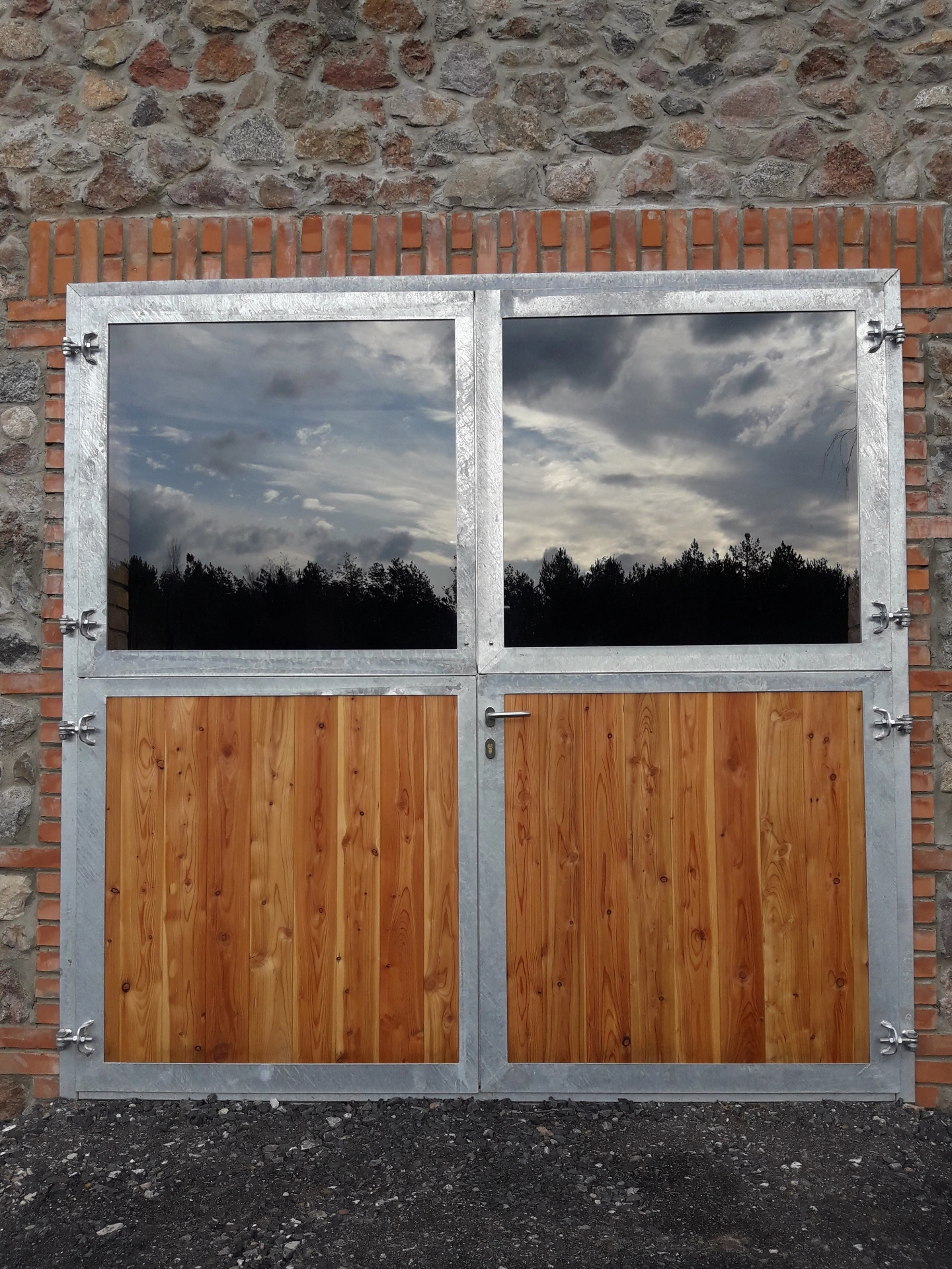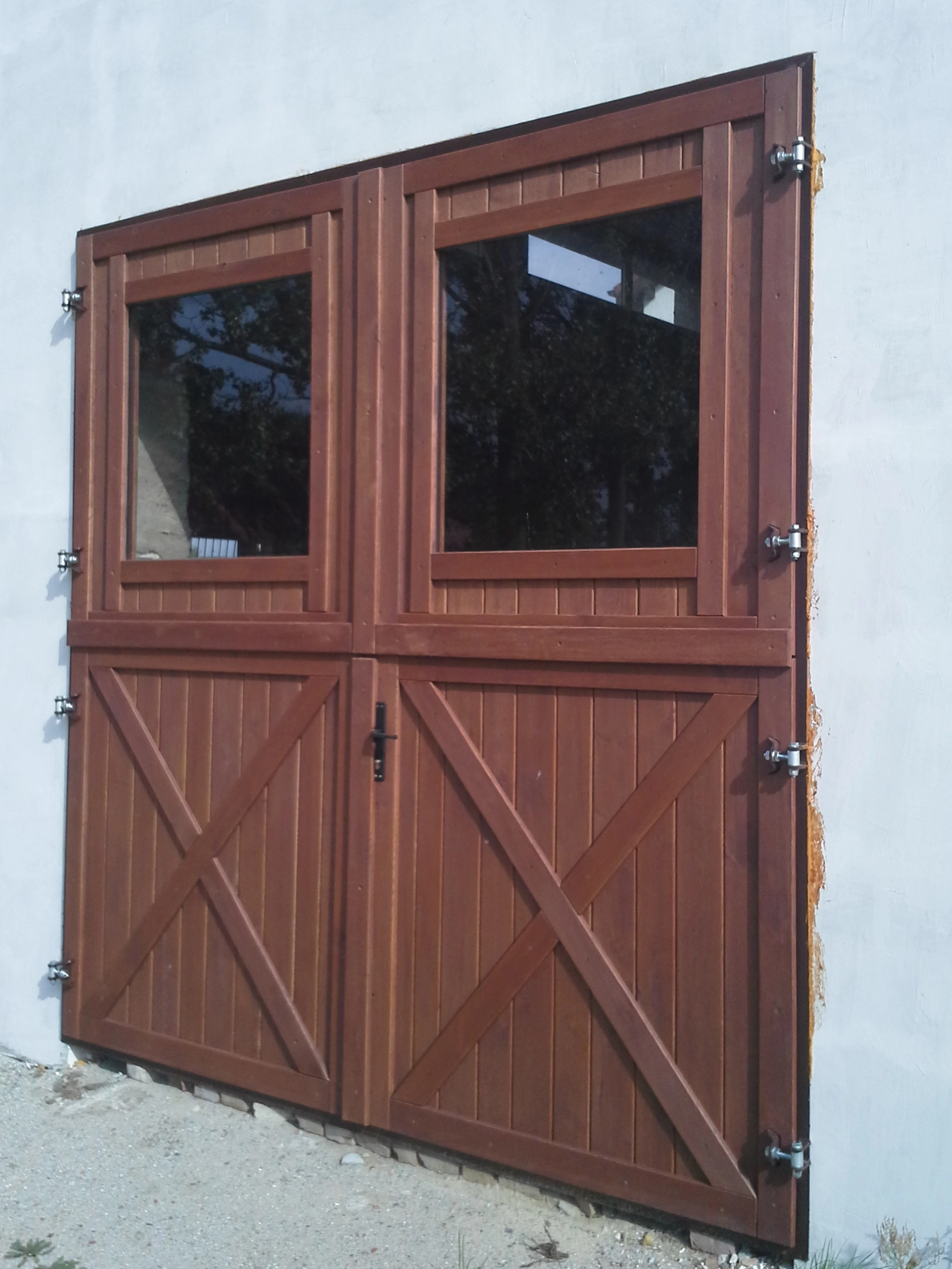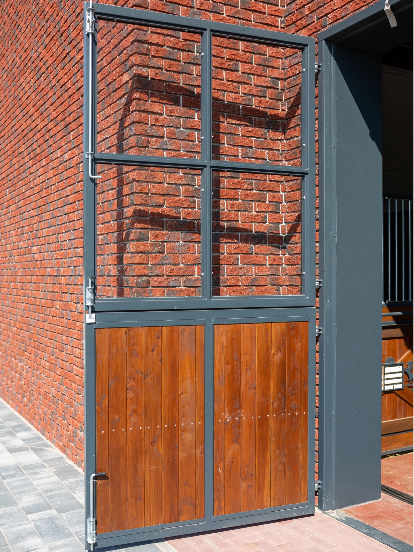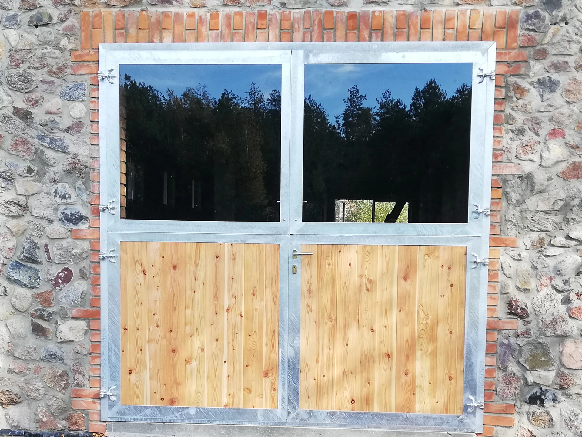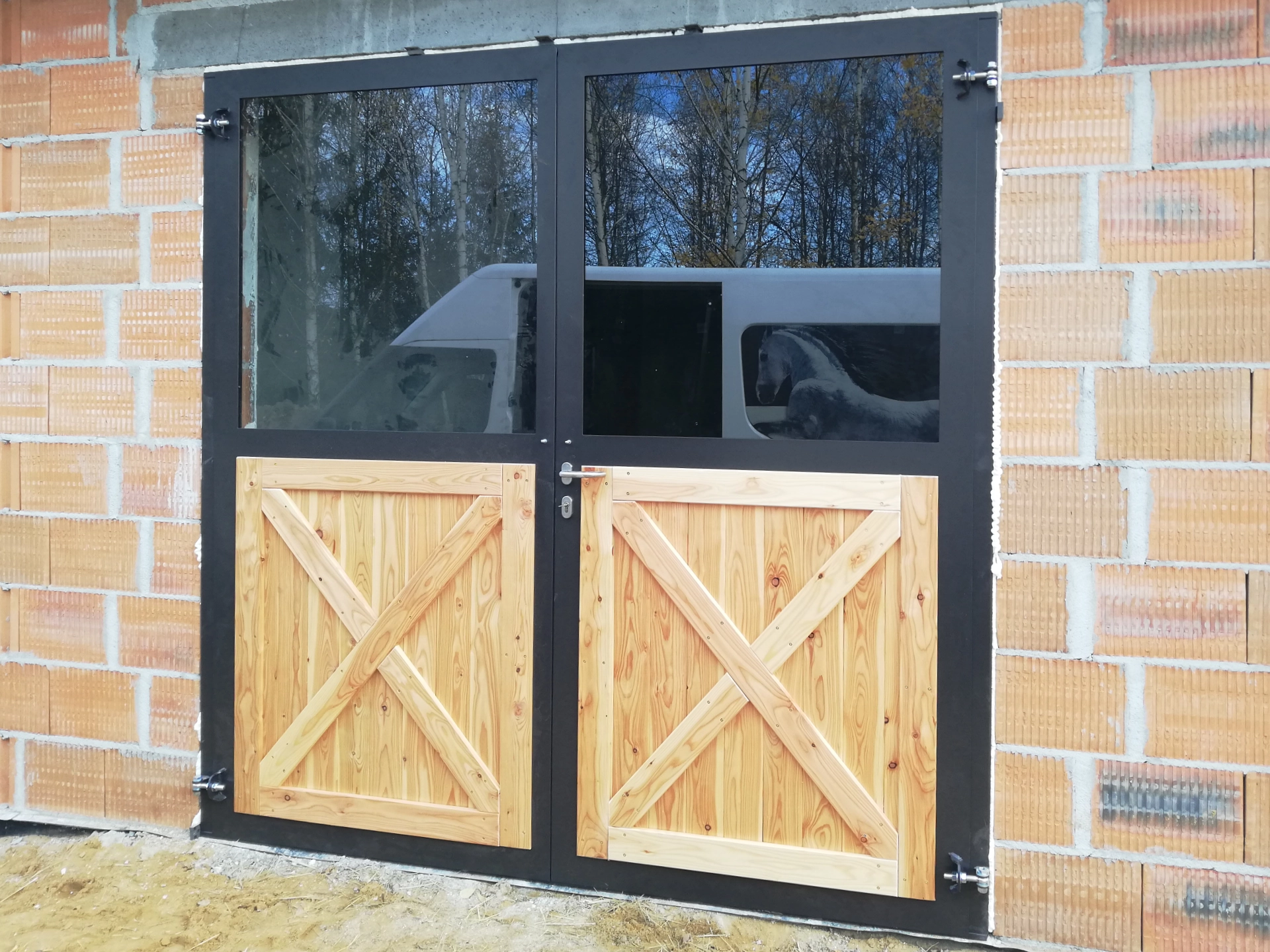 Dolna część tej bramy stajennej wypełniona jest deskami, w górnej znajdują się okna. Tego typu rozwiązanie pozwala zajrzeć do środka bez otwierania całości i wychładzania jej zimą, a także przepuszcza światło dzienne, niezbędne do regulacji cyklu dobowego zwierząt.
