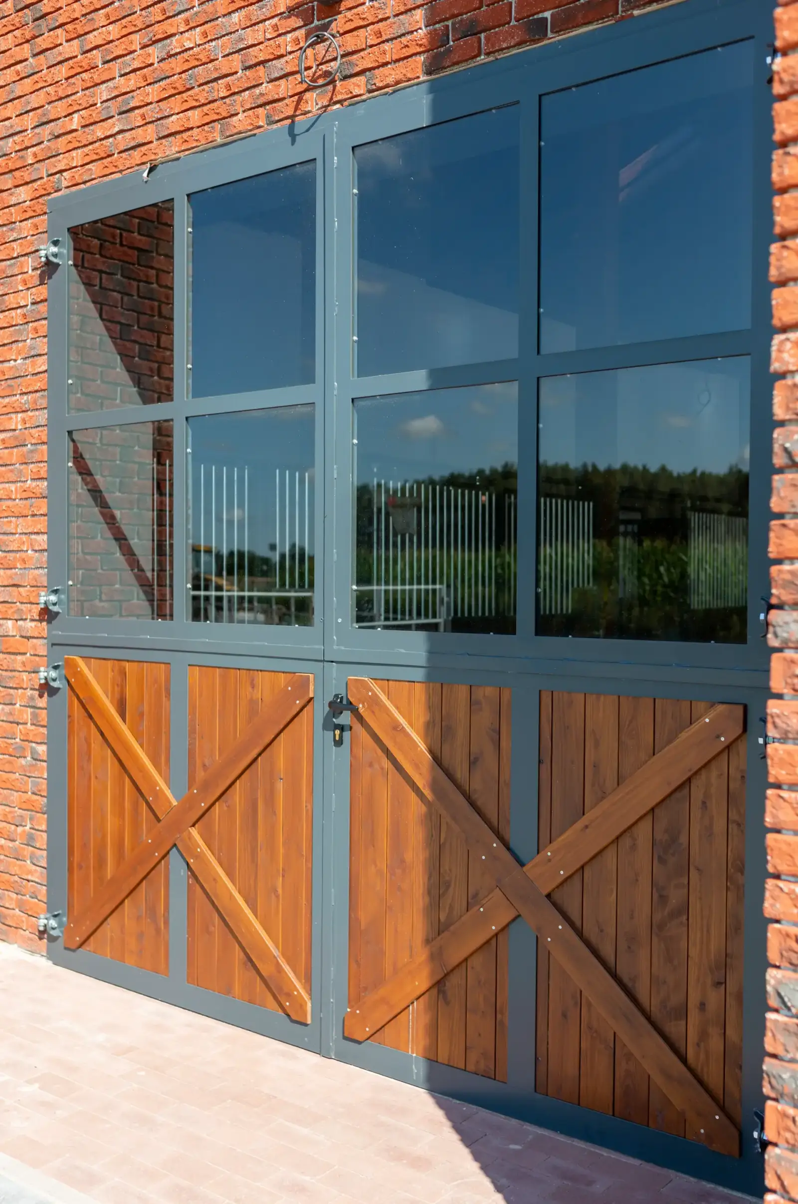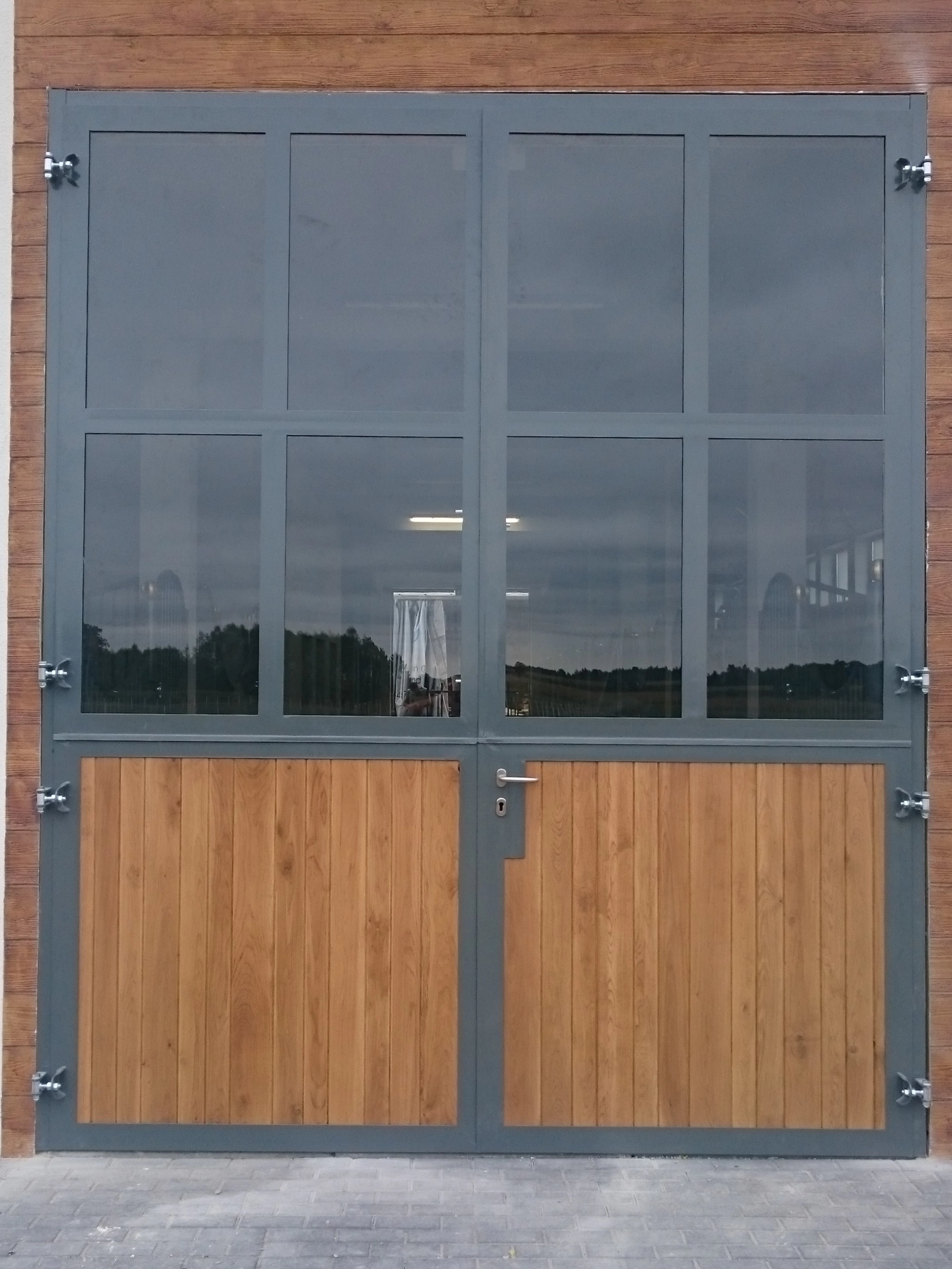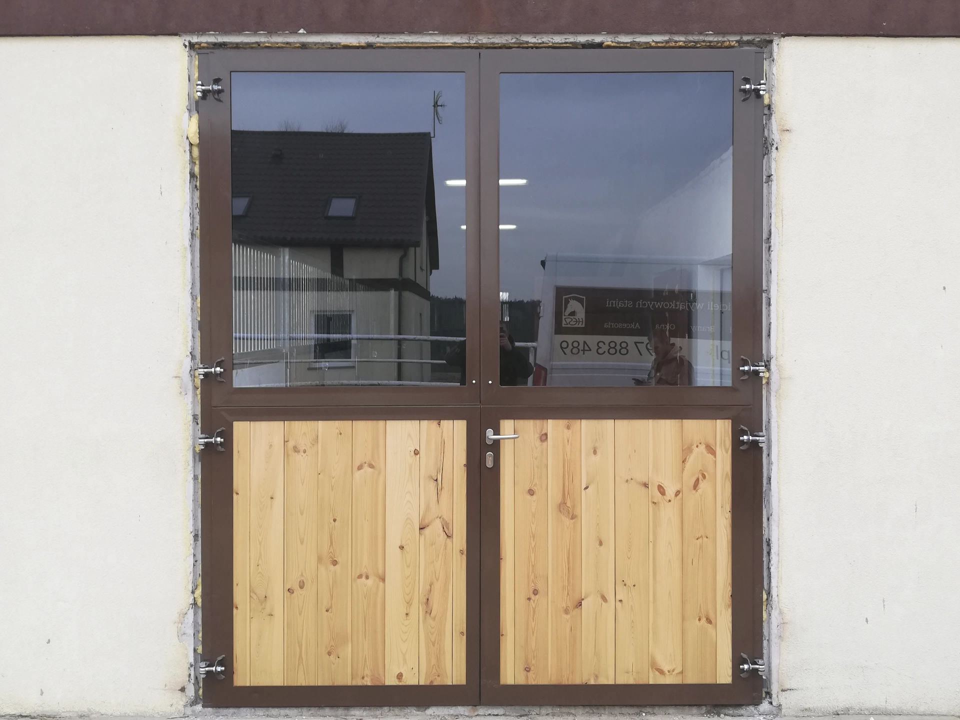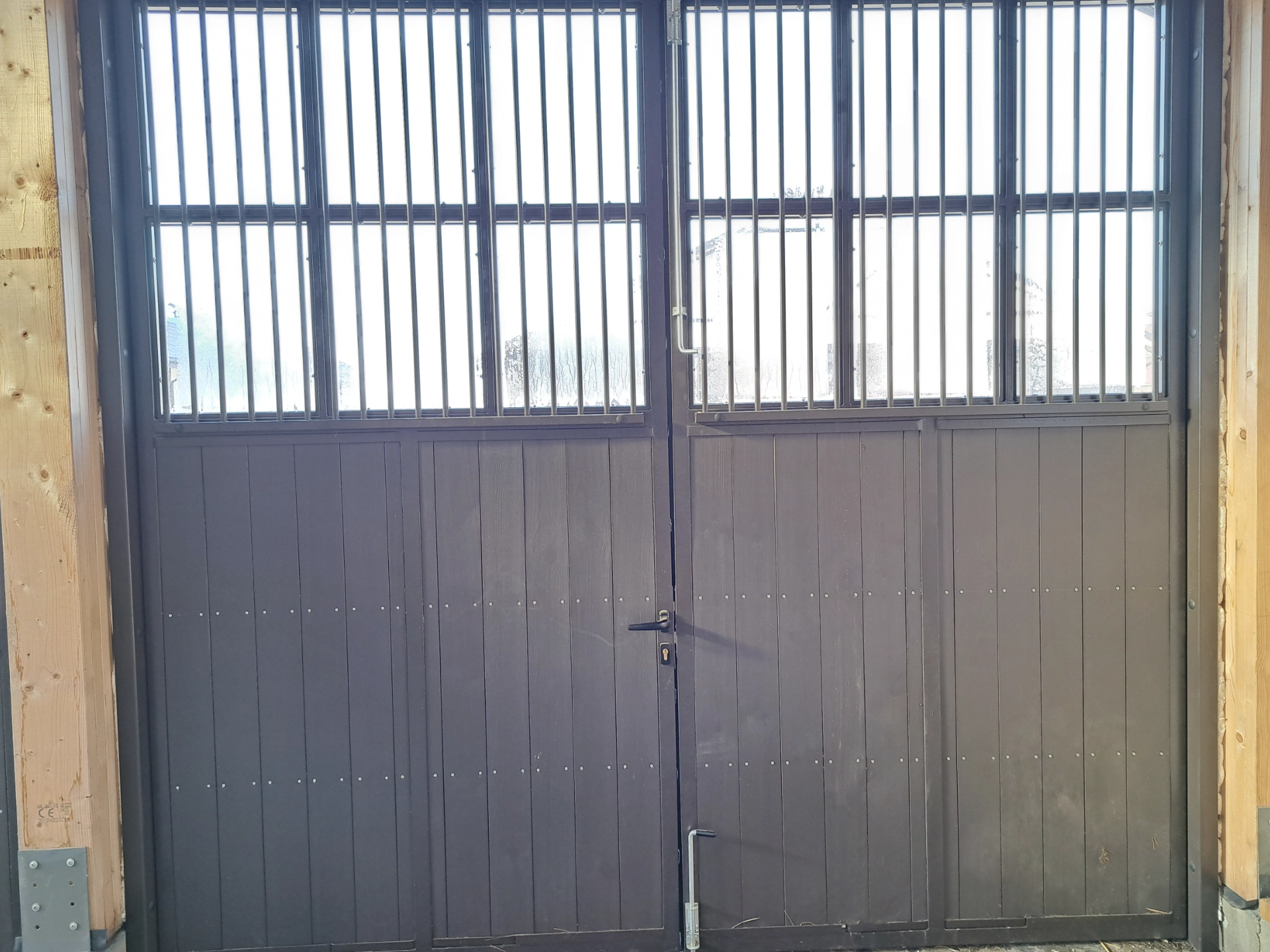 Dolna część tej bramy stajennej wypełniona jest deskami, w górnej znajdują się okna. Tego typu rozwiązanie pozwala zajrzeć do środka bez otwierania całości i wychładzania jej zimą, a także przepuszcza światło dzienne, niezbędne do regulacji cyklu dobowego zwierząt.