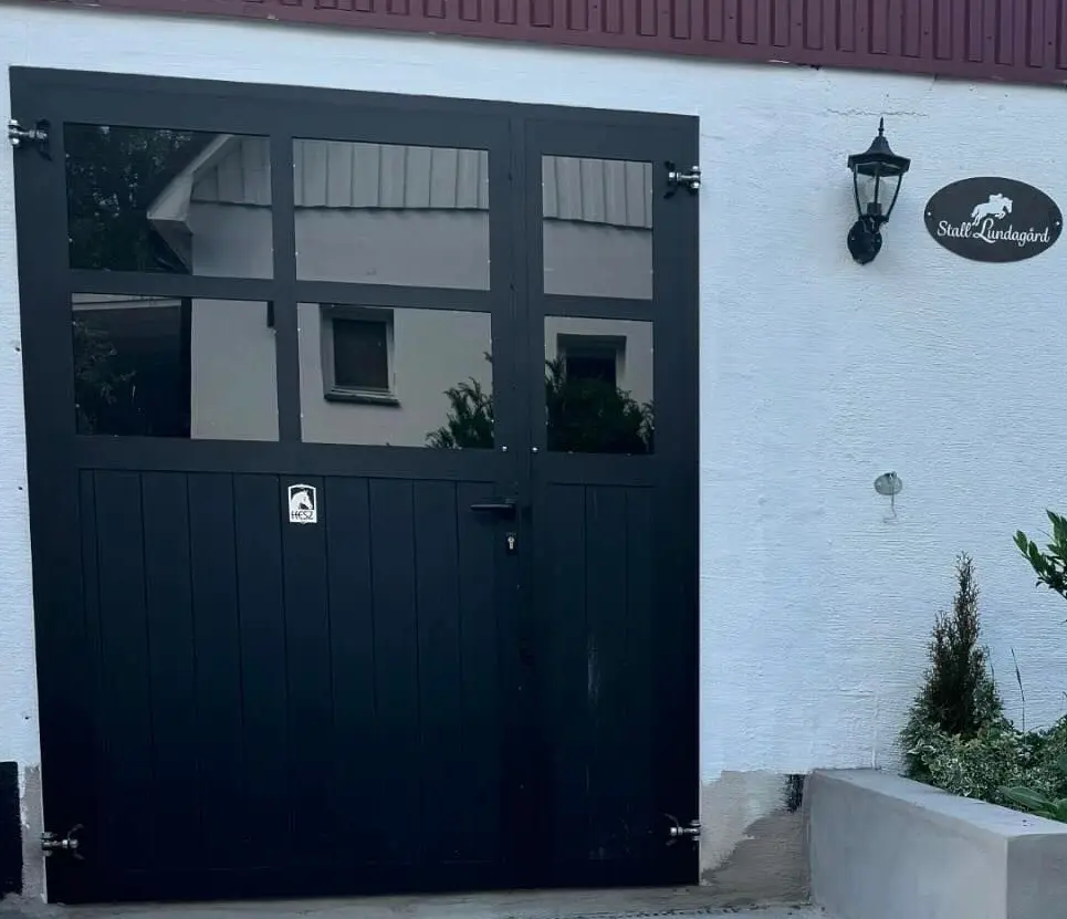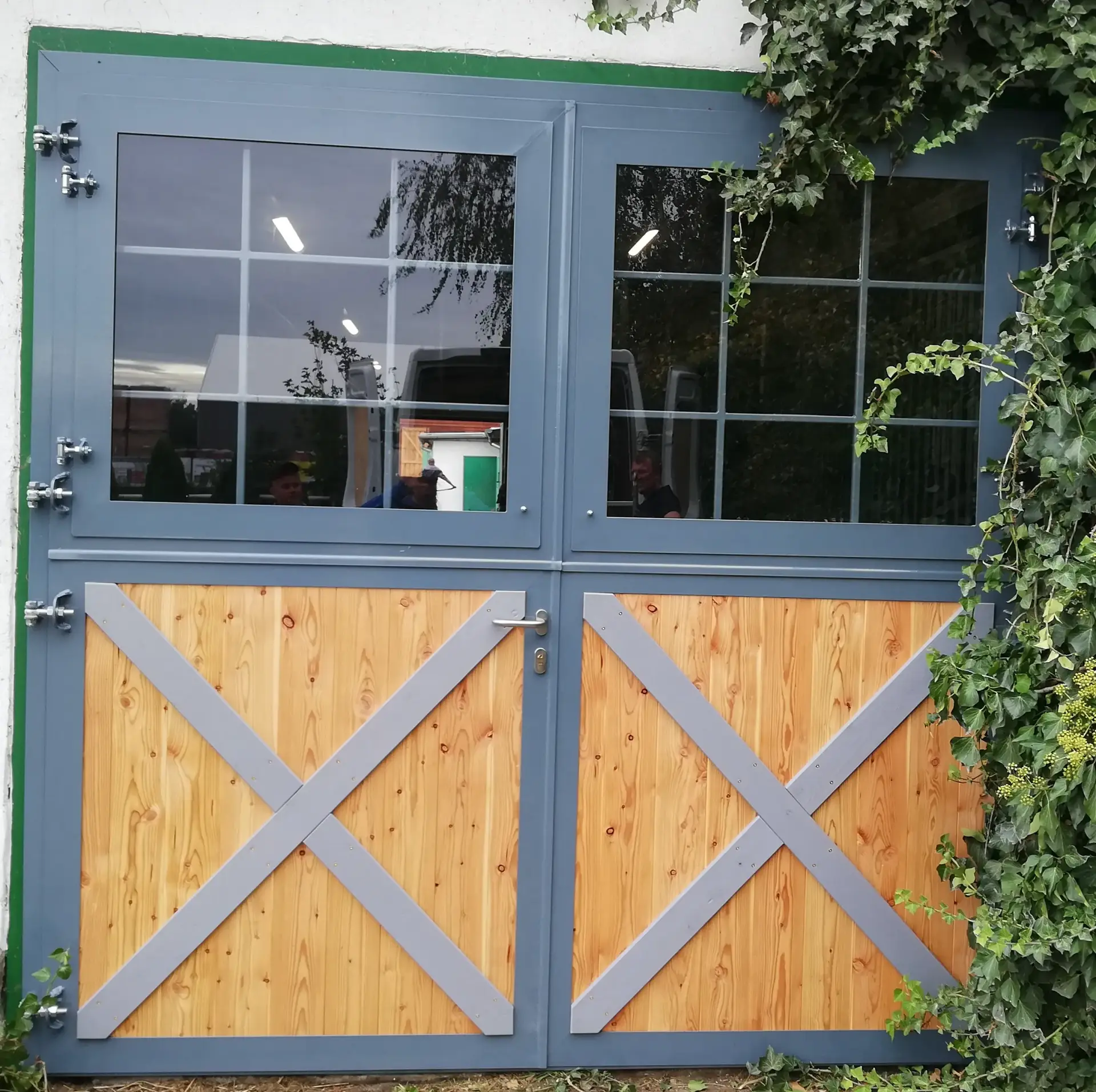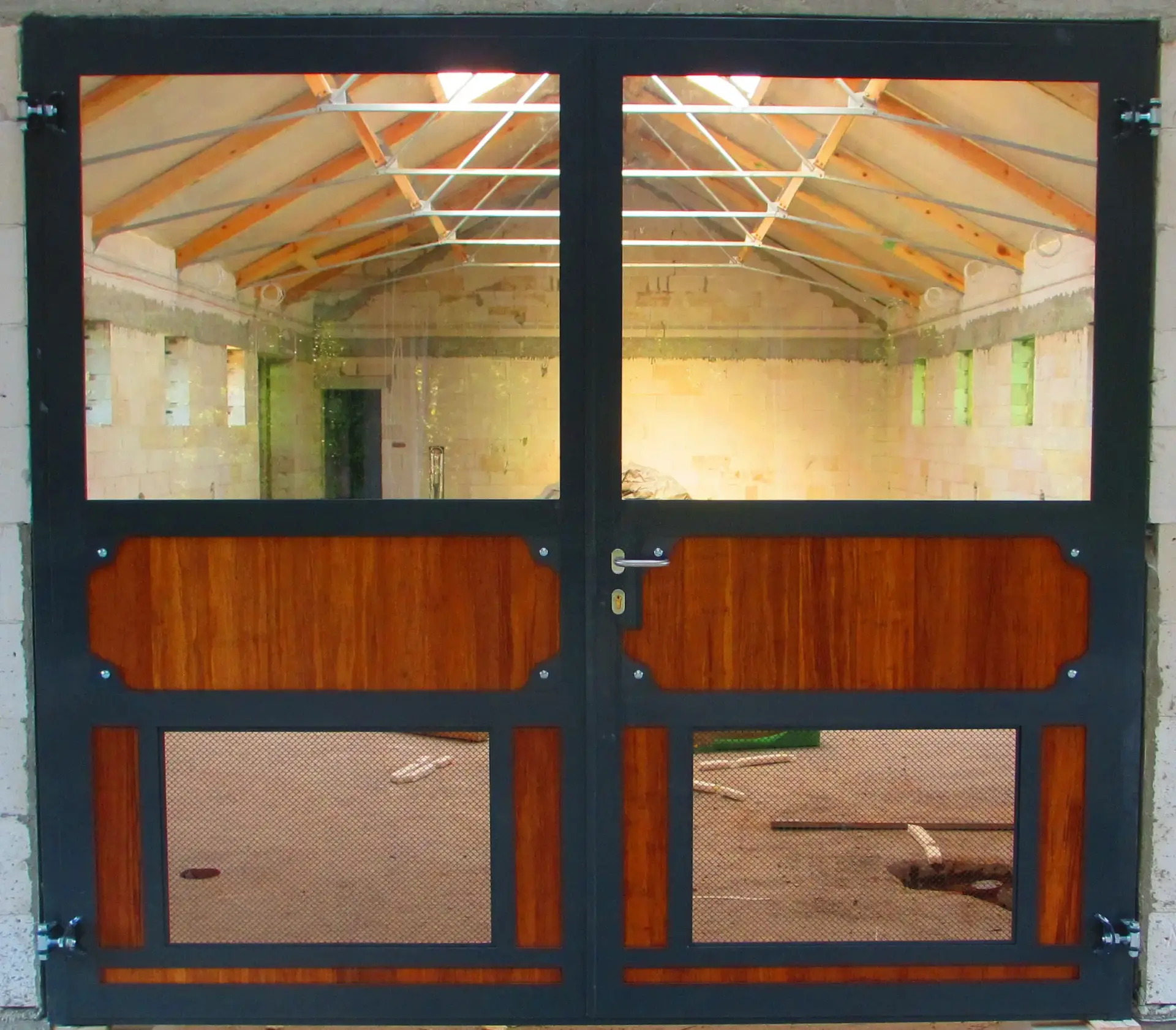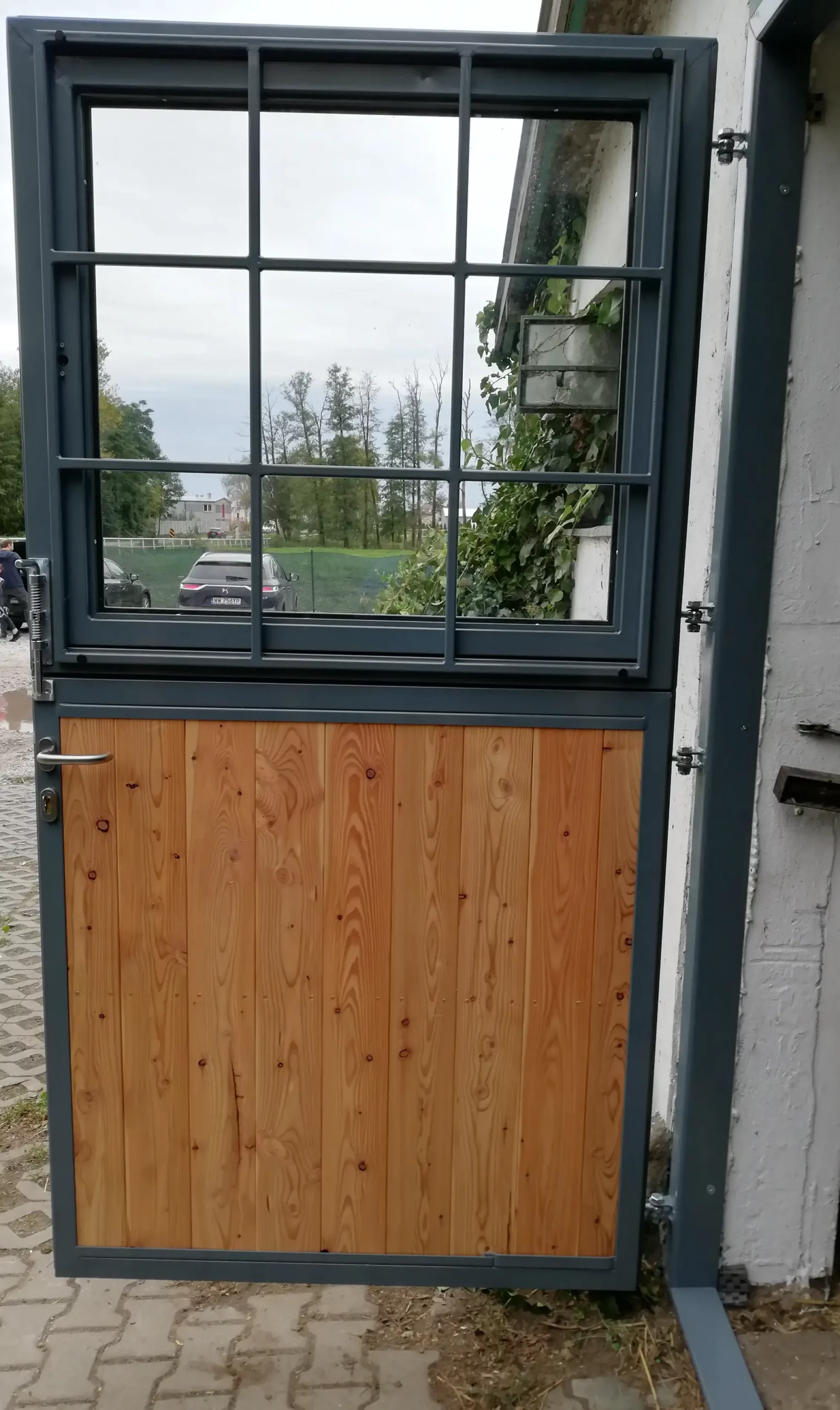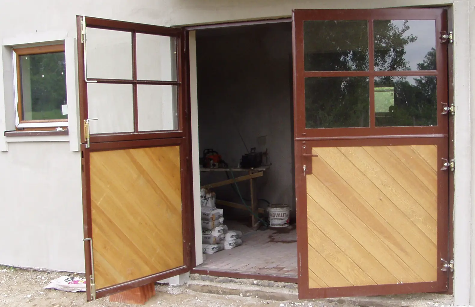 Dolna część tej bramy stajennej wypełniona jest deskami, w górnej znajdują się okna. Tego typu rozwiązanie pozwala zajrzeć do środka bez otwierania całości i wychładzania jej zimą, a także przepuszcza światło dzienne, niezbędne do regulacji cyklu dobowego zwierząt.
