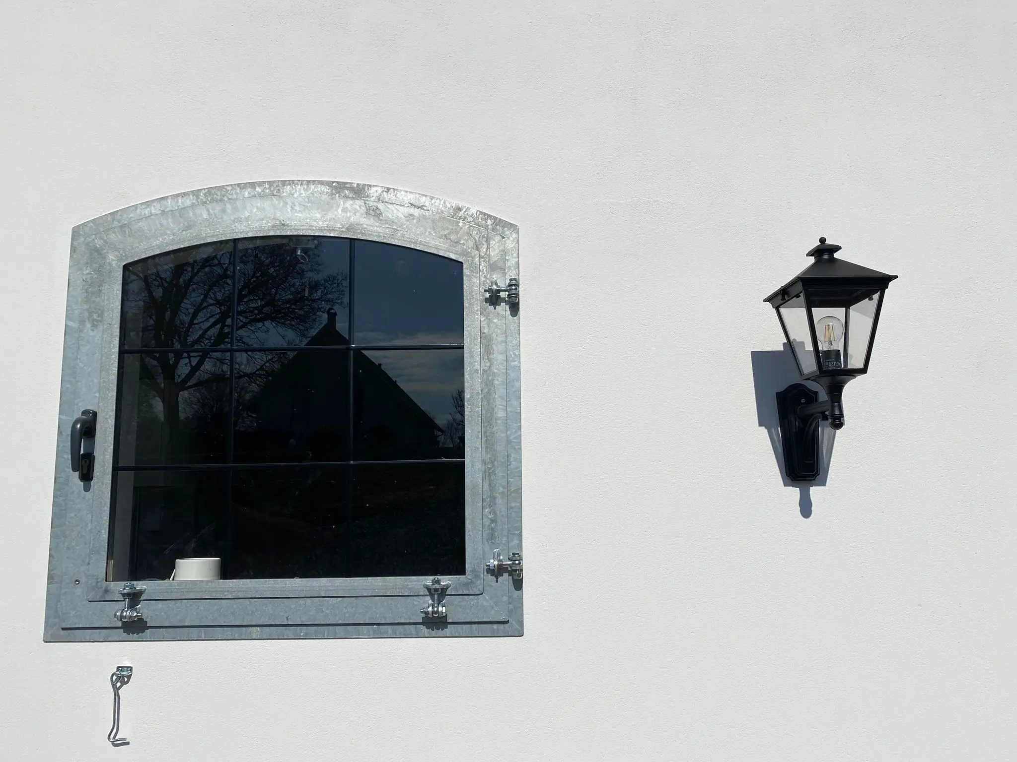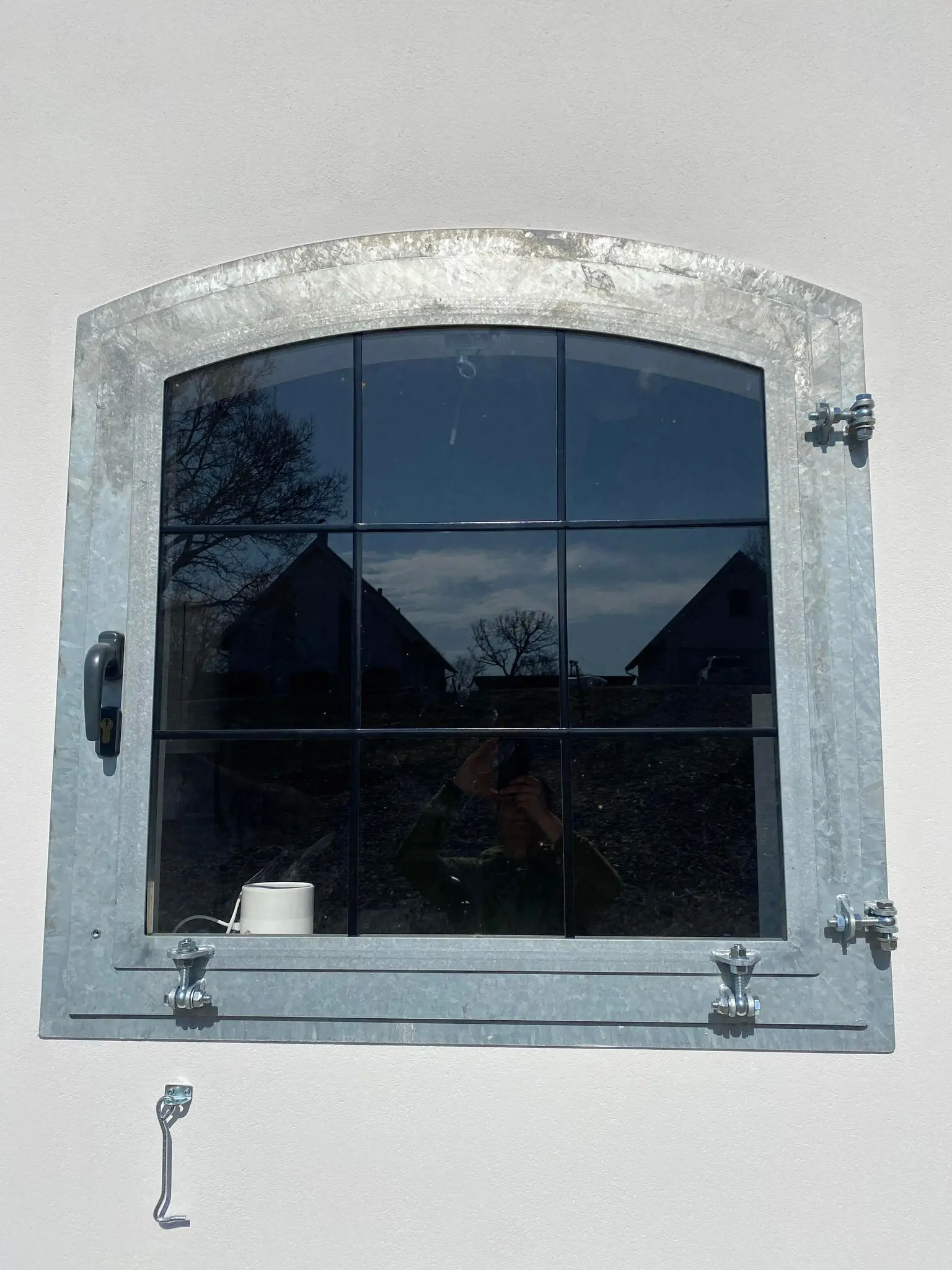 Okno otwierano-uchylne na zewnątrz, szyba bezpieczna, szprosy, konstrukcja metalowa ocynkowana.