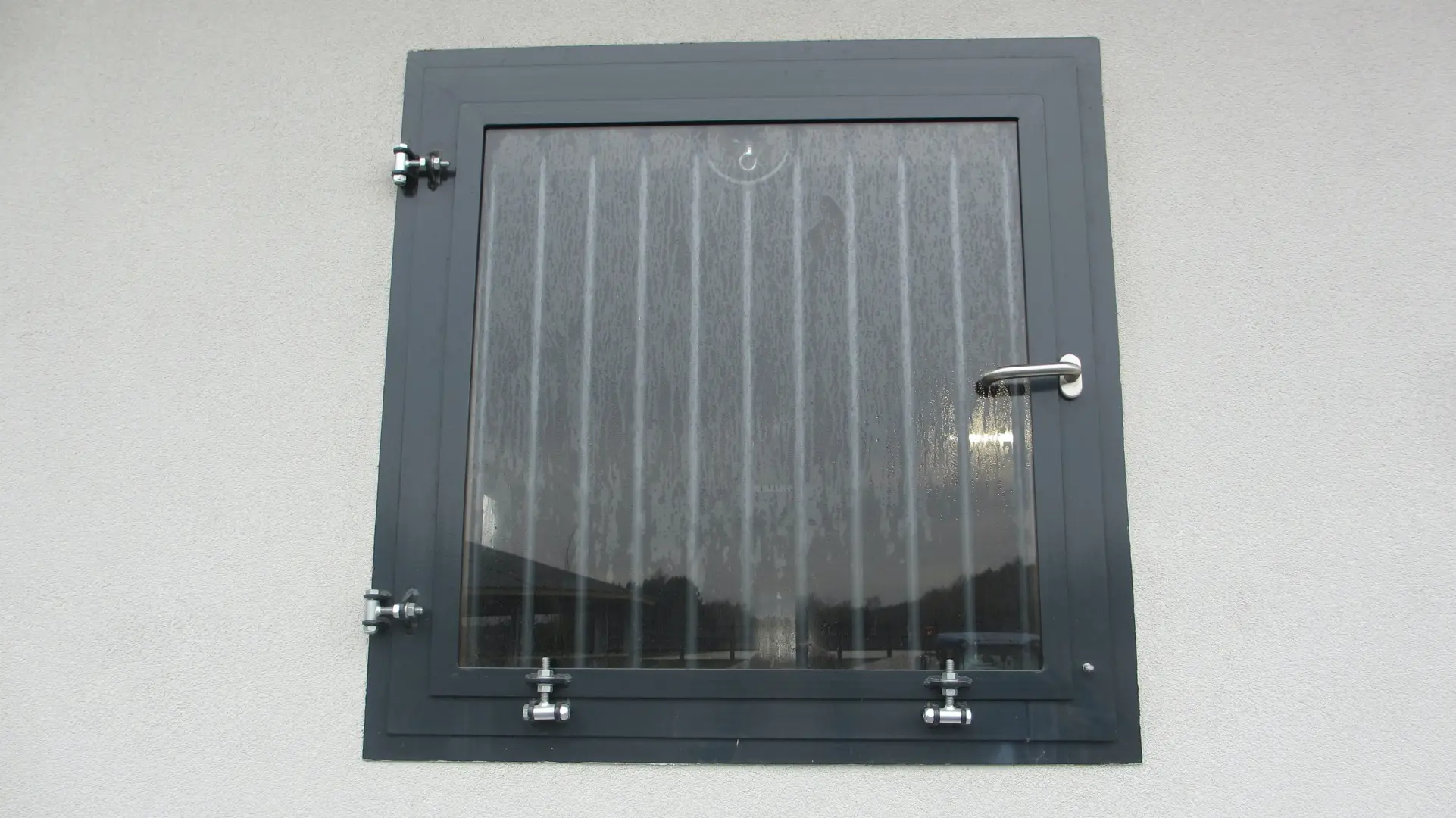 Okno uchylne na zewnątrz, szyba bezpieczna, krata, konstrukcja metalowa ocynkowana.
