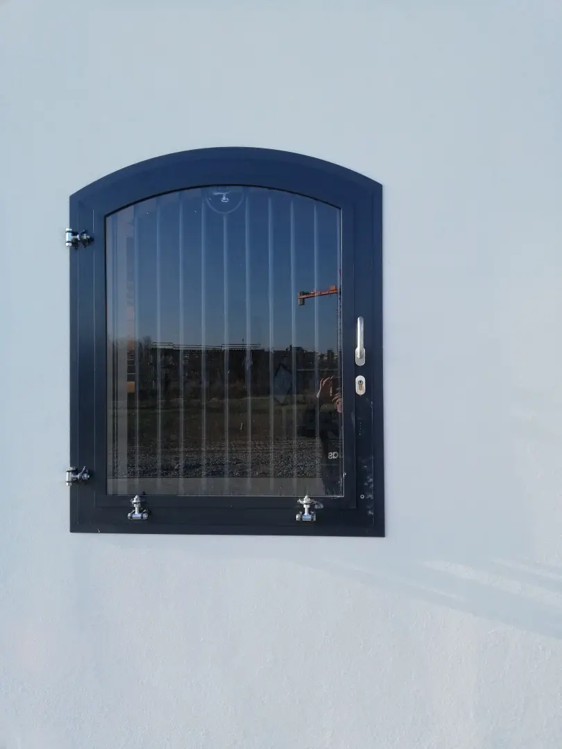 Okno otwierano-uchylne na zewnątrz, szyba bezpieczna, krata, konstrukcja metalowa ocynkowana i pomalowana proszkowo.