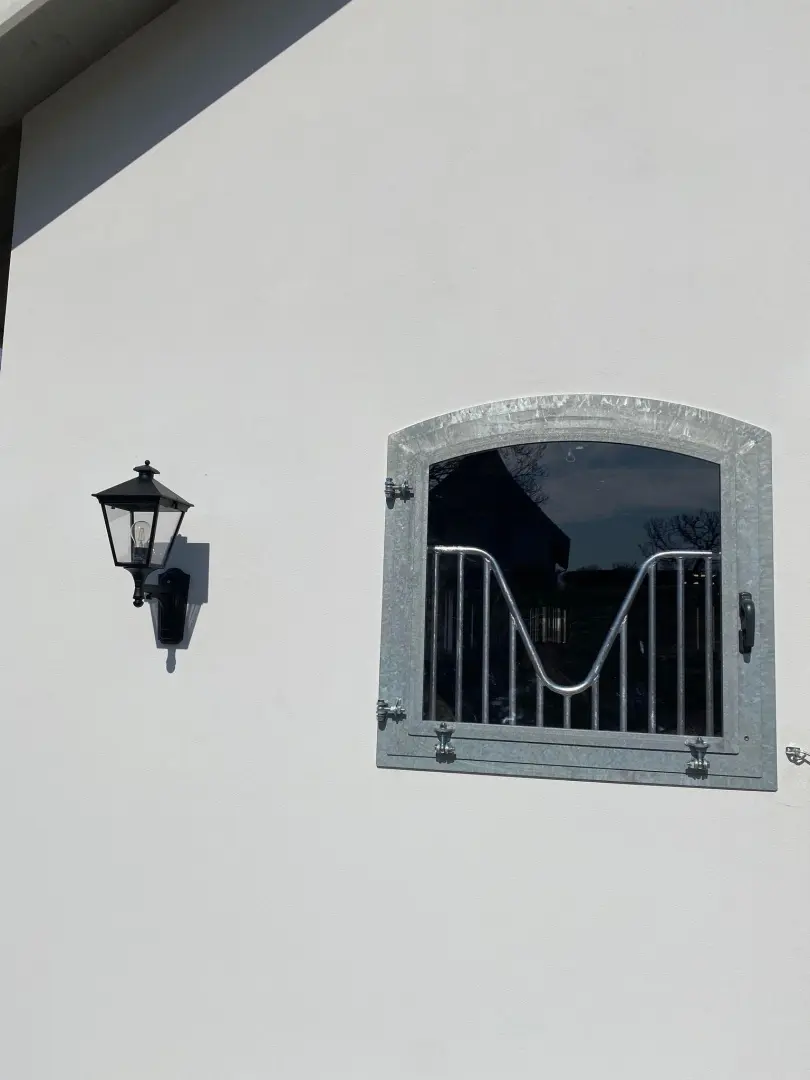 Okno otwierano-uchylne do wewnątrz, szyba bezpieczna, krata i szprosy, konstrukcja metalowa ocynkowana i pomalowana proszkowo.