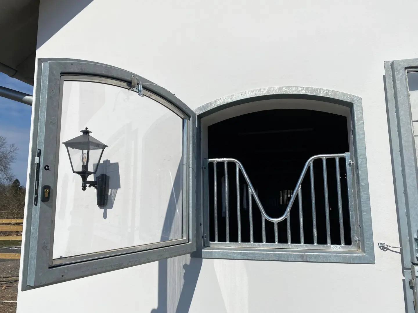 Okno otwierane, szyba bezpieczna, krata i szprosy, konstrukcja metalowa ocynkowana i pomalowana proszkowo.