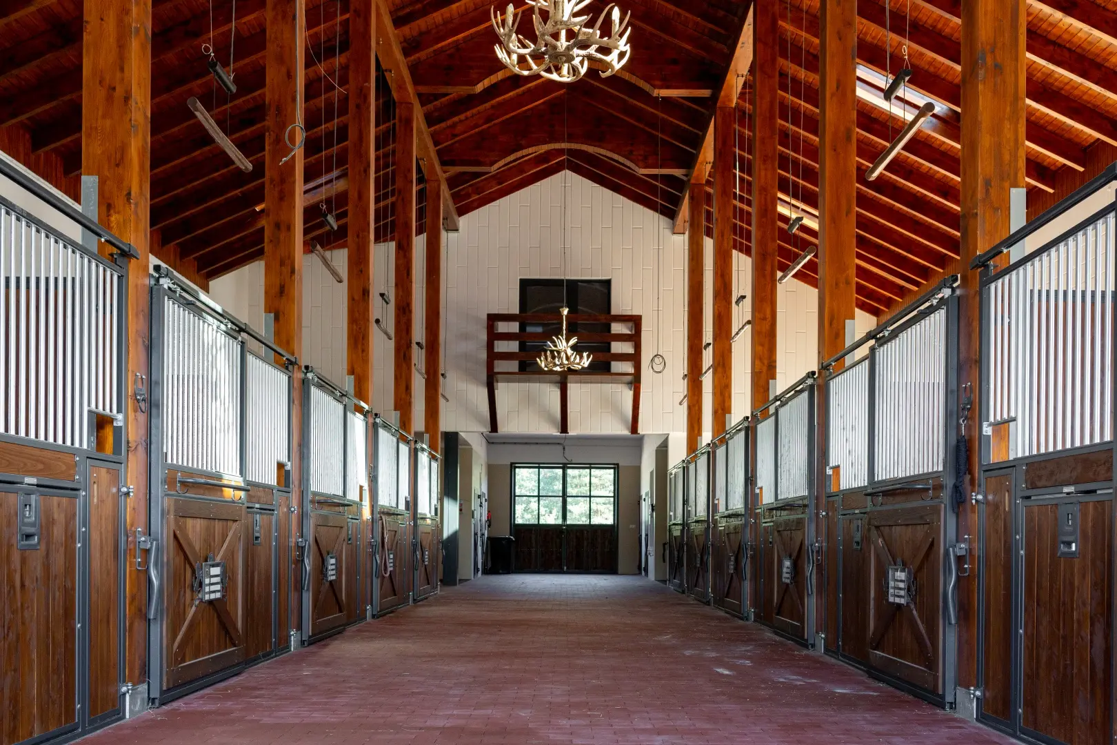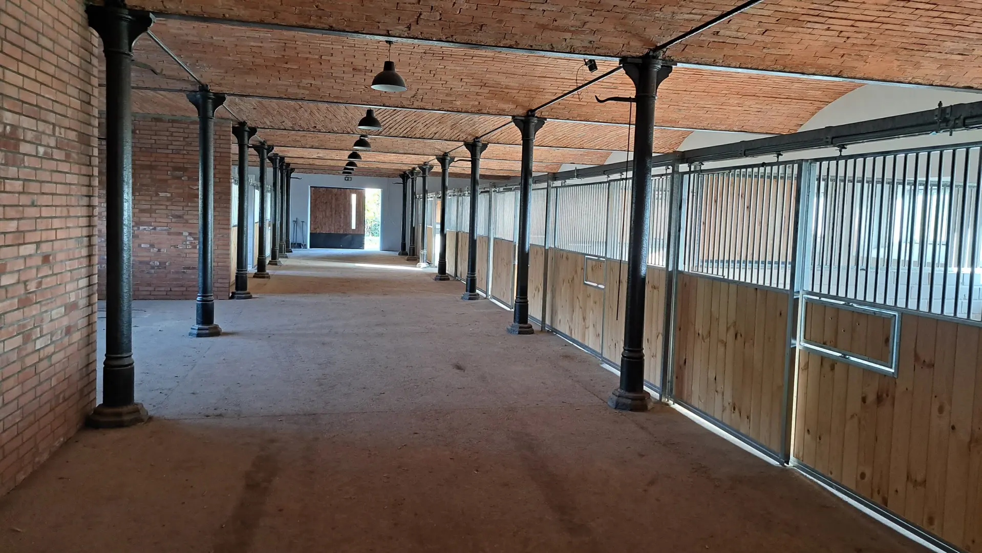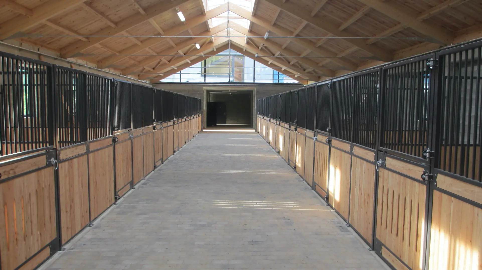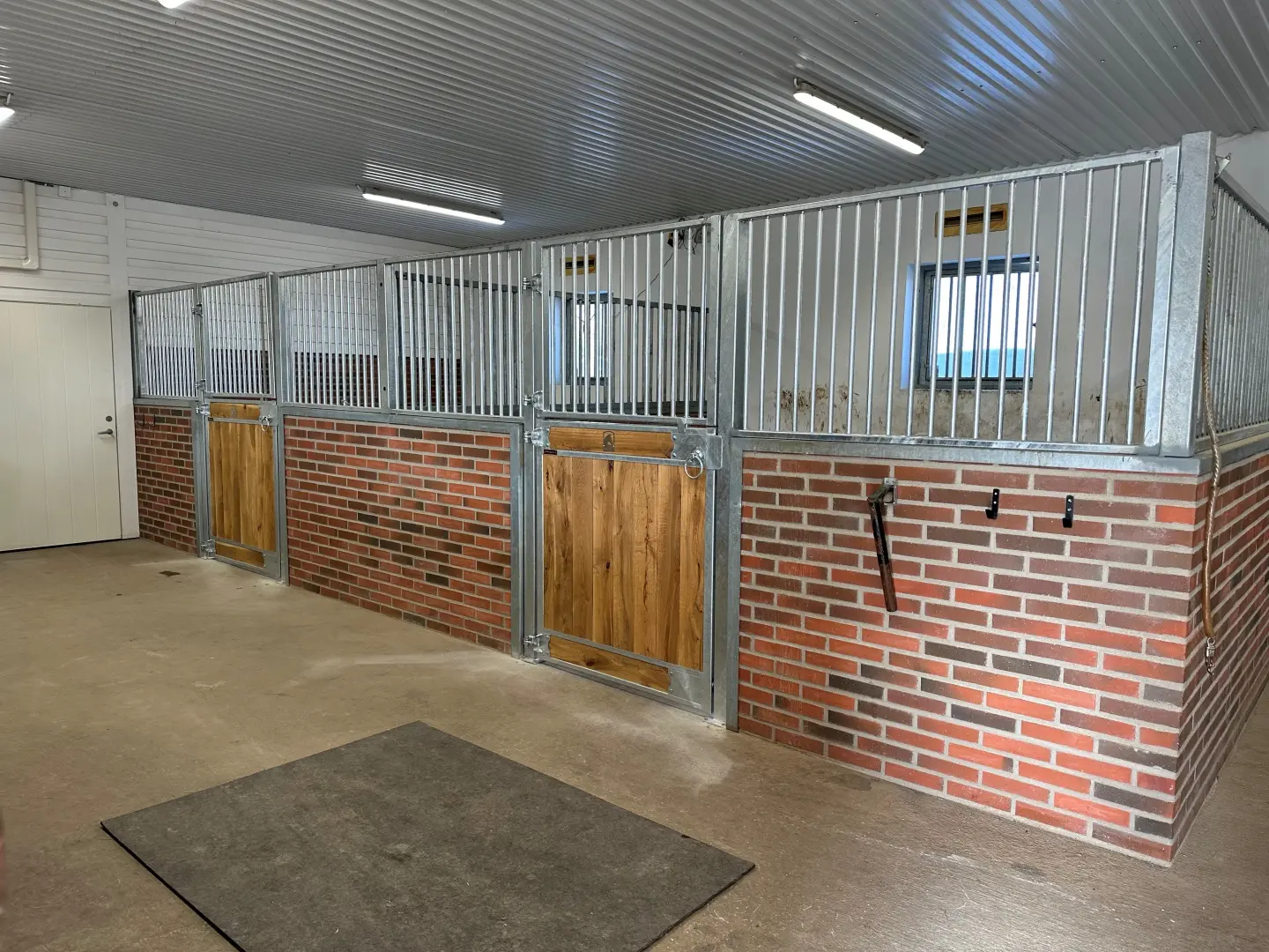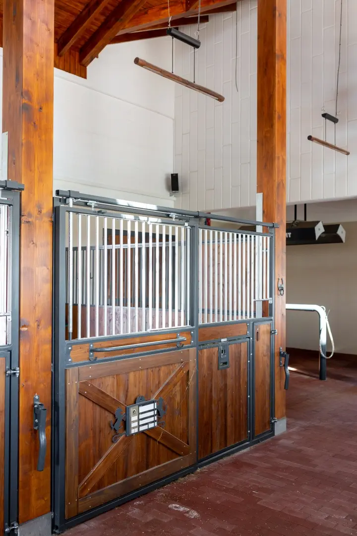 Deski sosnowe malowane, konstrukcja ocynkowana i pomalowana proszkowo, rurki ocynkowane, dodatkowo zawieszka na derkę, szafka, paśnik Easy Hay, tabliczka informacyjna, dodatkowa ramka z „x” w drzwiach.