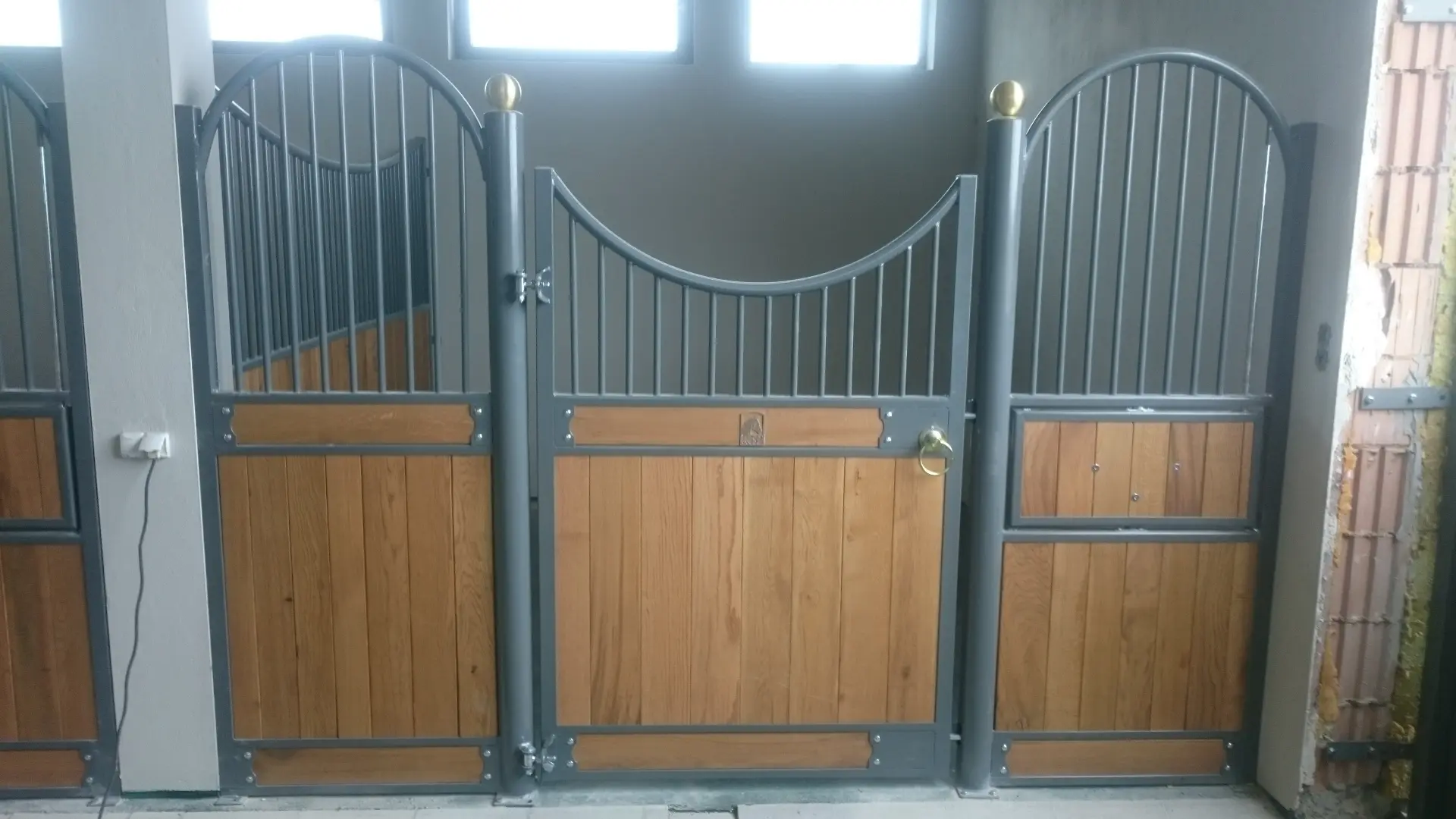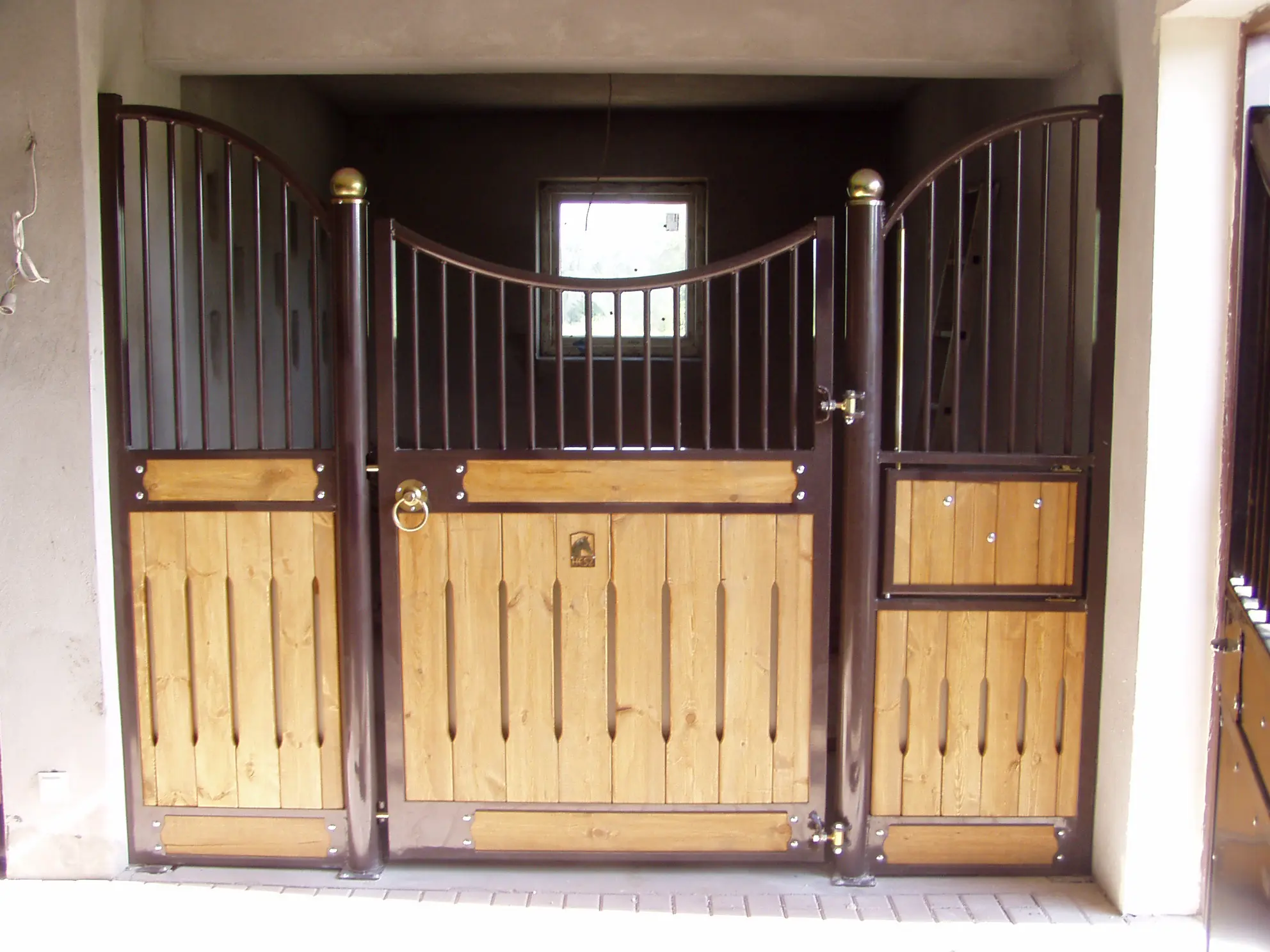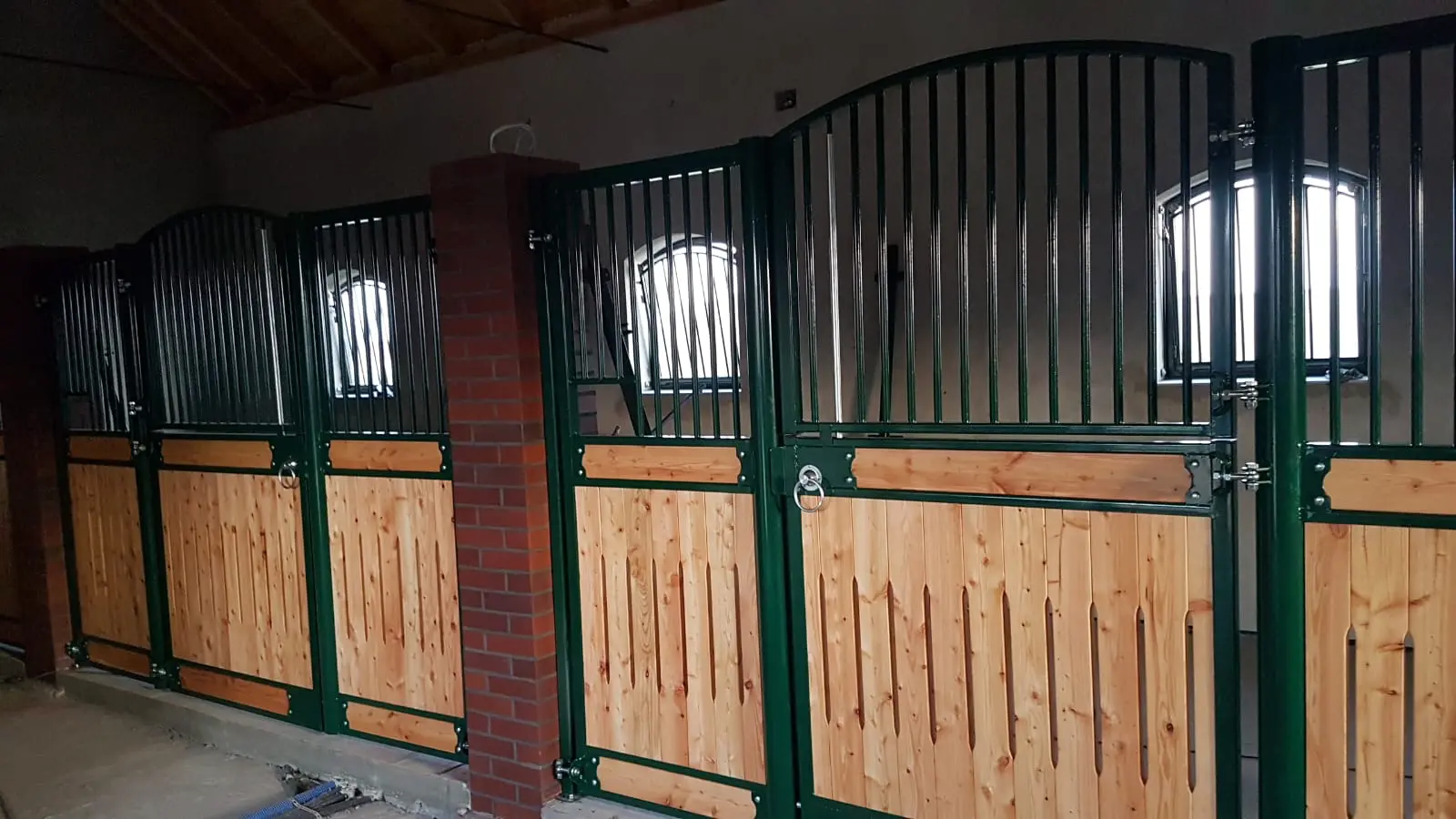 Deski sosnowe malowane, konstrukcja ocynkowana i pomalowana proszkowo, rurki ocynkowane, deski sosnowe malowane, konstrukcja ocynkowana i pomalowana proszkowo, rurki ocynkowane, dodatkowo zawieszka na derkę, szafka, paśnik Easy Hay, tabliczka informacyjna, dodatkowa ramka z „x” w drzwiach.