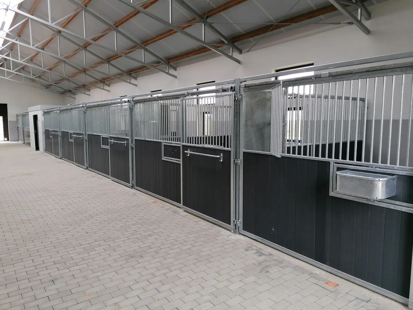 Deski PVC, konstrukcja ocynkowana, dodatkowo ramka obrotowa koryta, system Easy Clean do łatwego czyszczenia boksu, paśnik narożny, zawieszka na derkę.