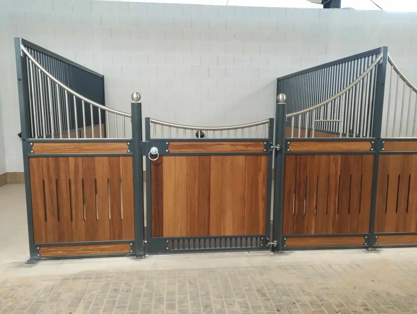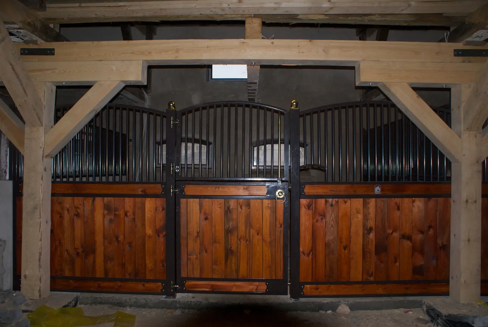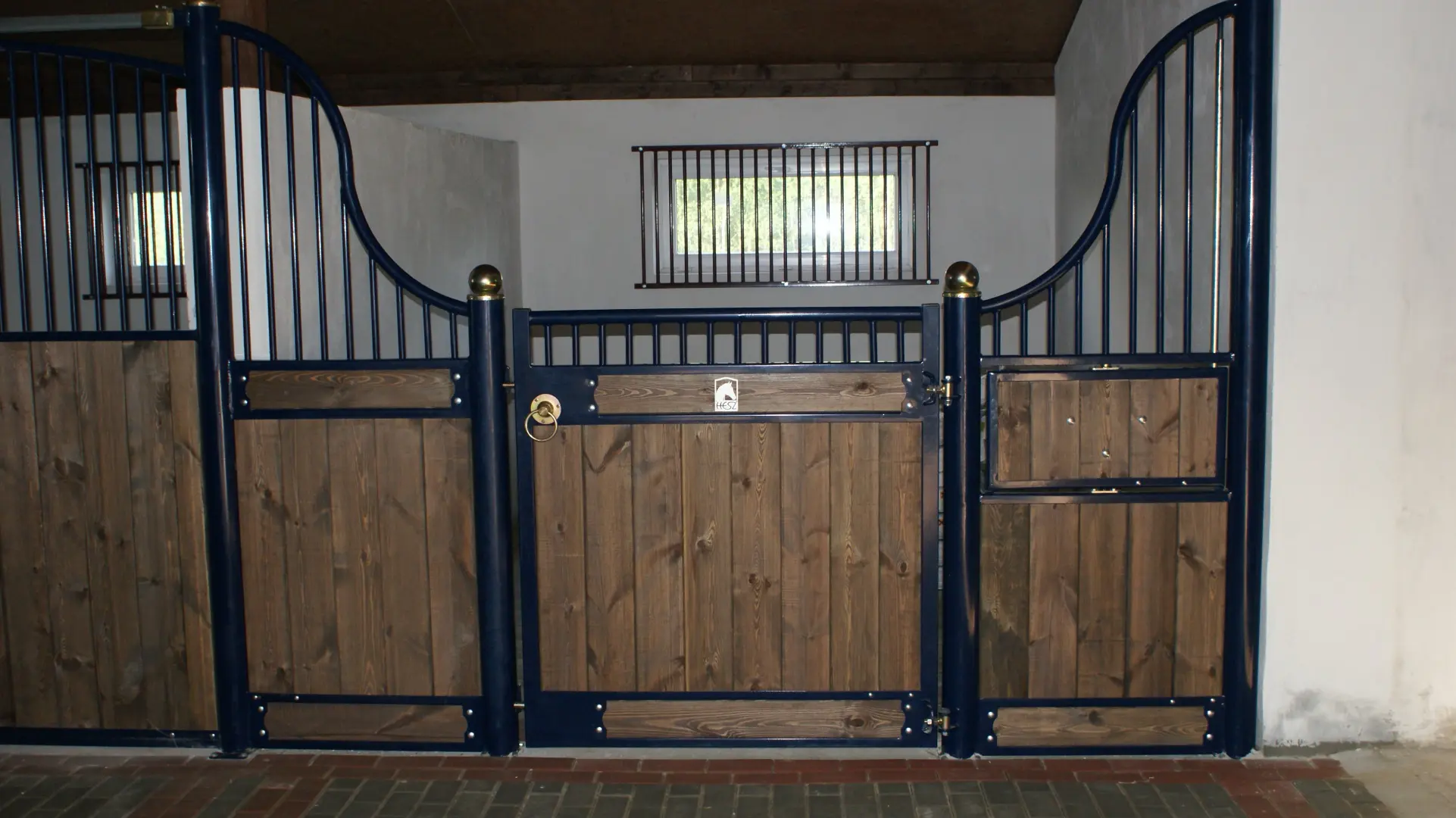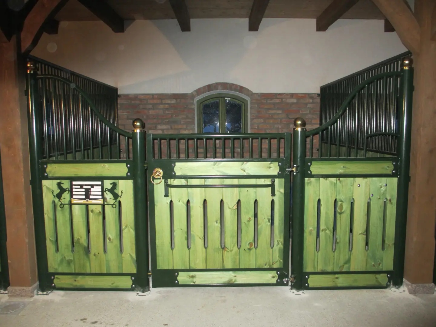 Deski sosnowe malowane, kule ozdobne ze stali nierdzewnej pomalowane na złoty kolor, konstrukcja metalowa ocynkowana i pomalowana proszkowo, dodatkowo tabliczka informacyjna, zawieszka na derkę, wentylacja w deskach.