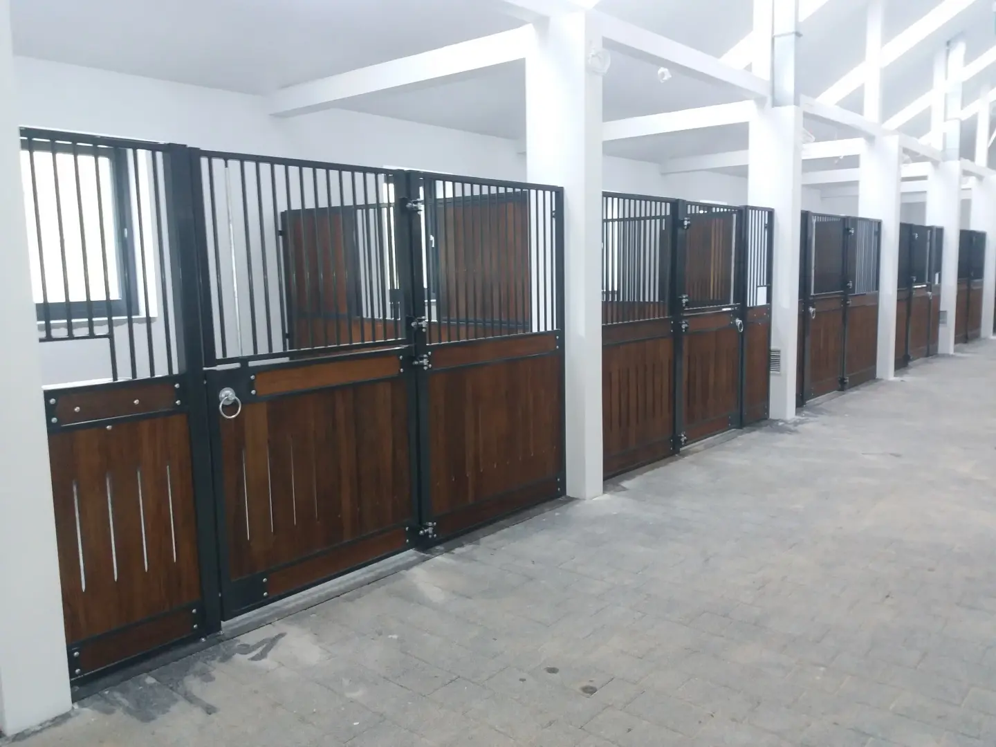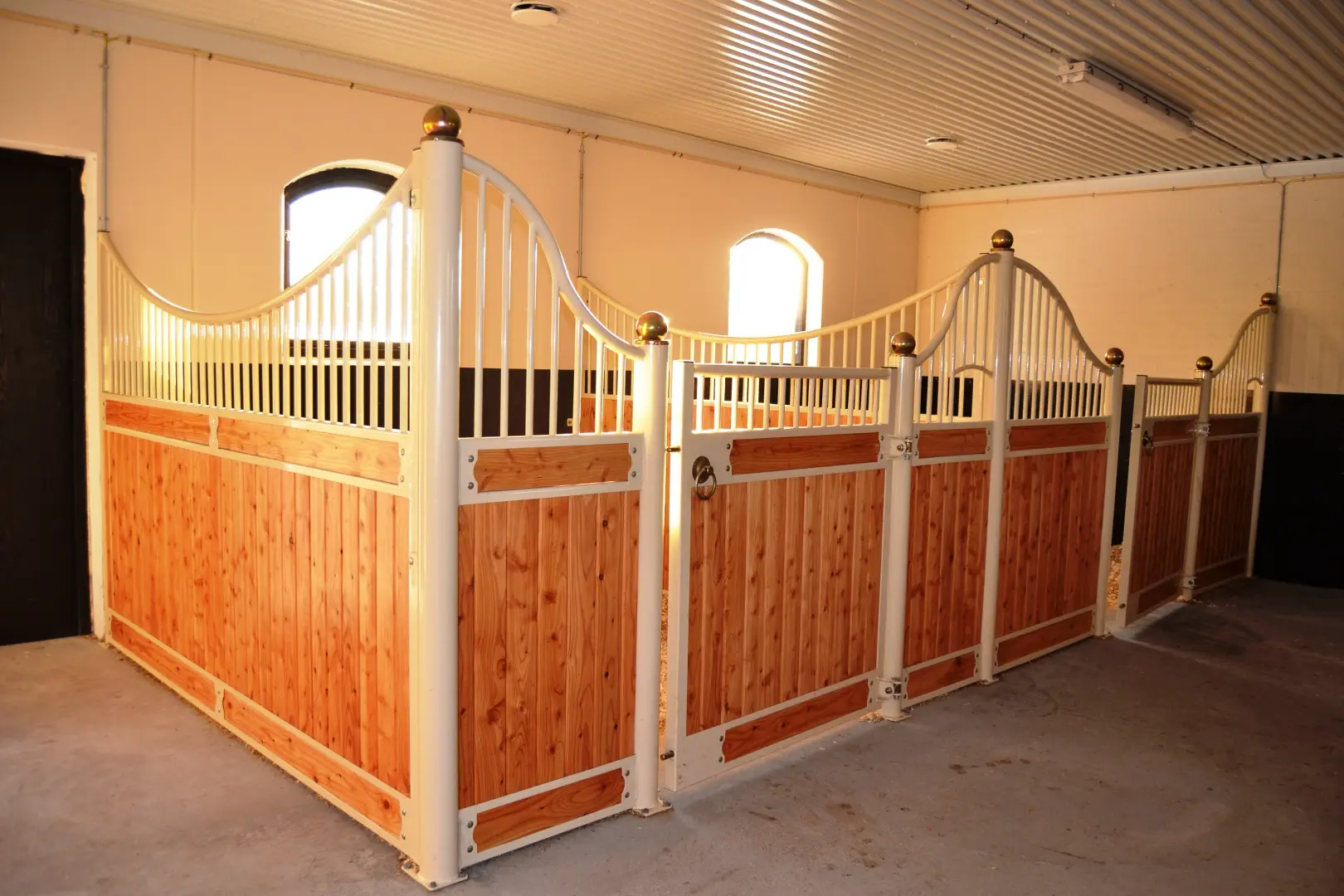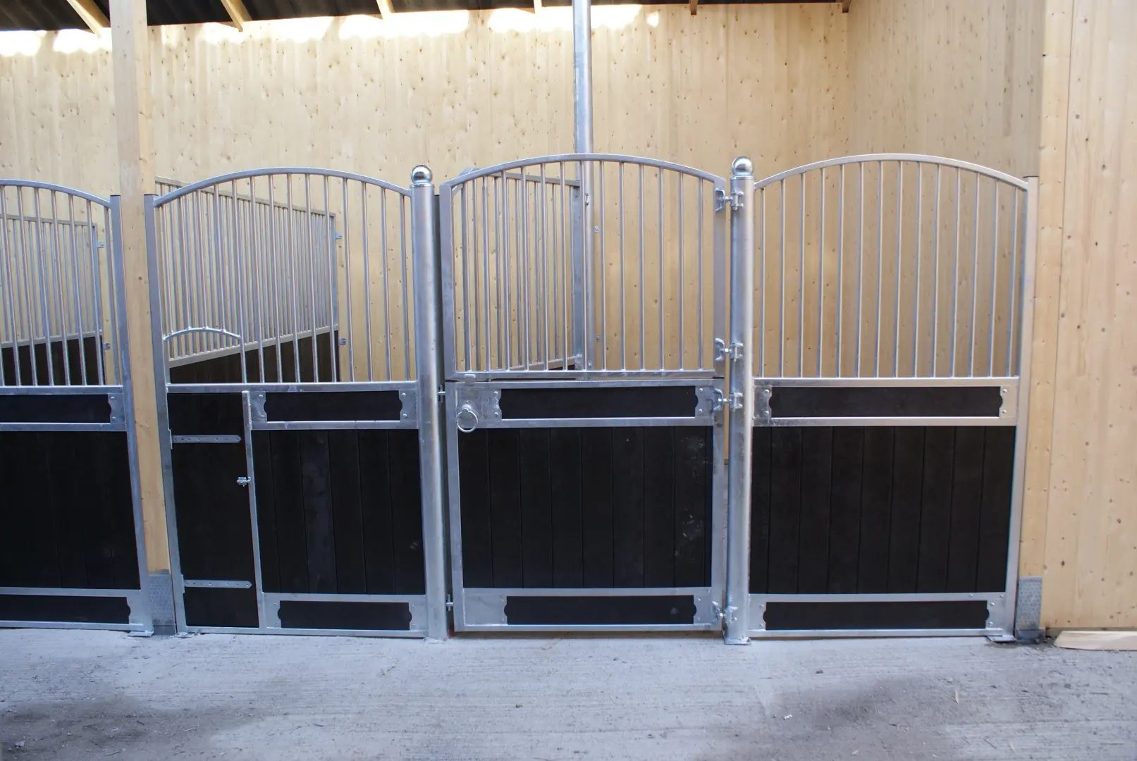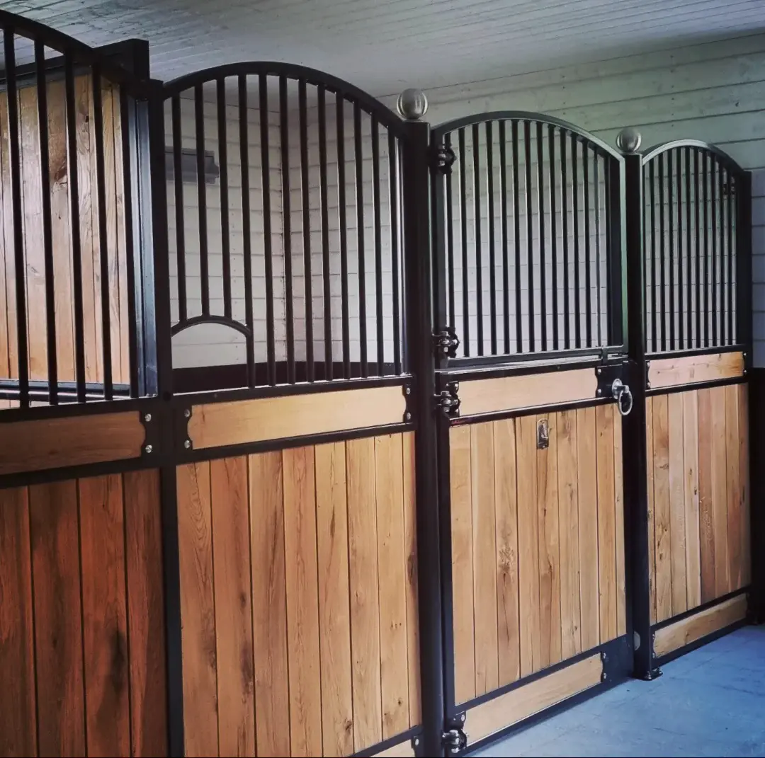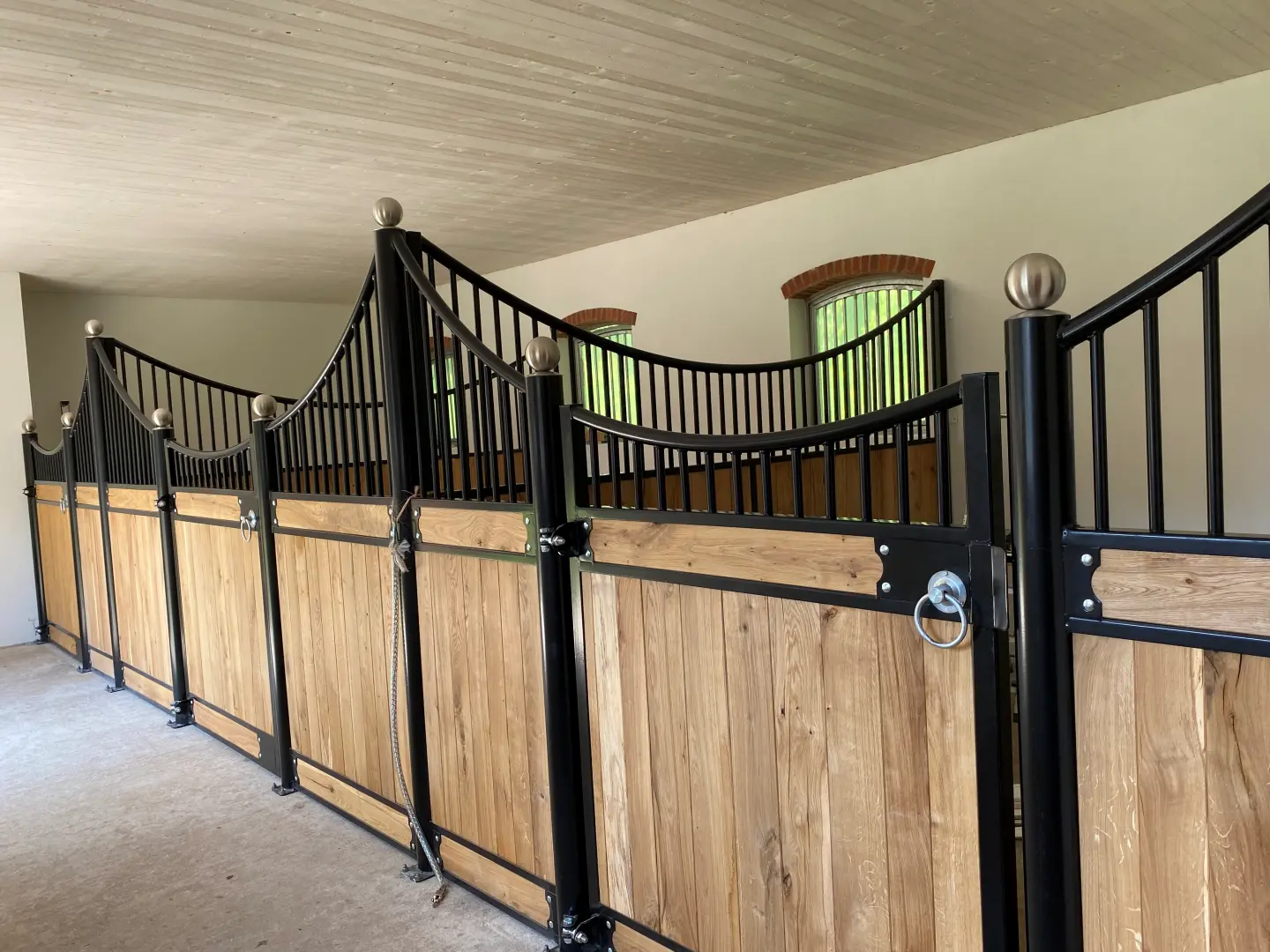 Deski sosnowe malowane, kule ozdobne ze stali nierdzewnej pomalowane na złoty kolor, konstrukcja metalowa ocynkowana i pomalowana proszkowo, dodatkowo tabliczka informacyjna, zawieszka na derkę, wentylacja w deskach.
