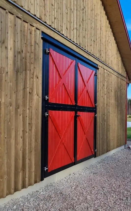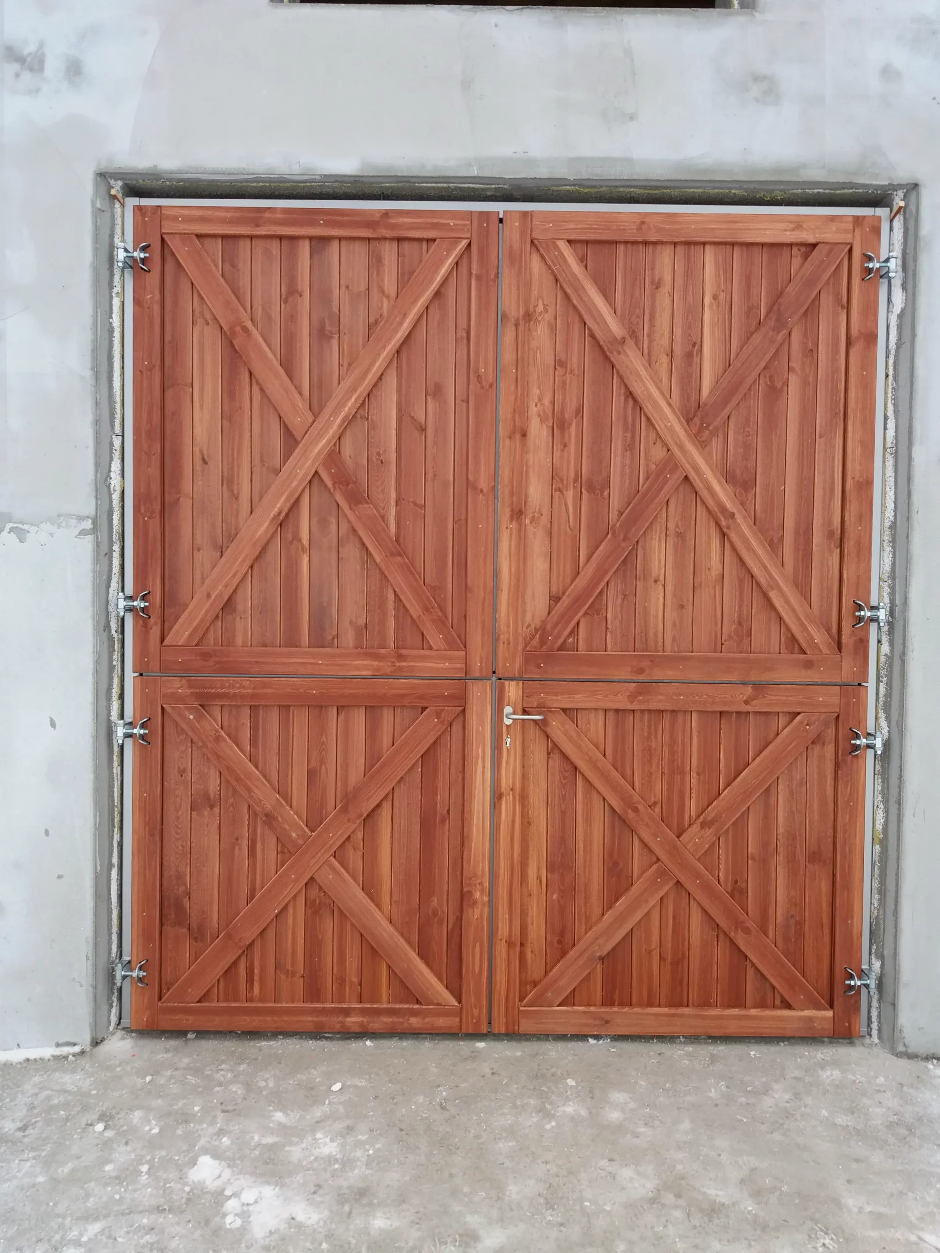 Drzwi jednoczęściowe, deski sosnowe impregnowane, konstrukcja metalowa ocynkowana.