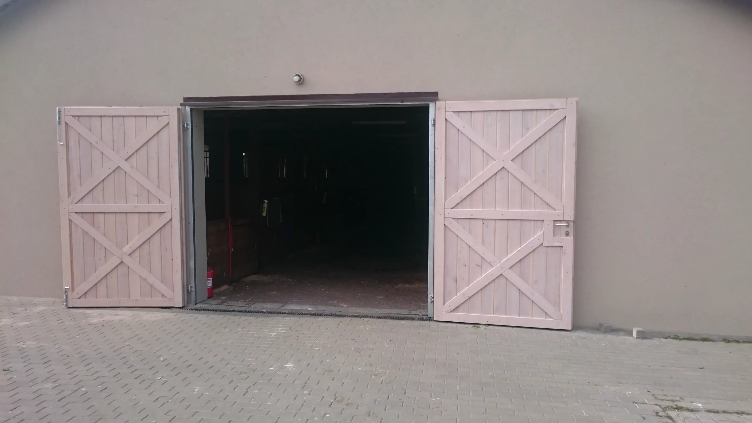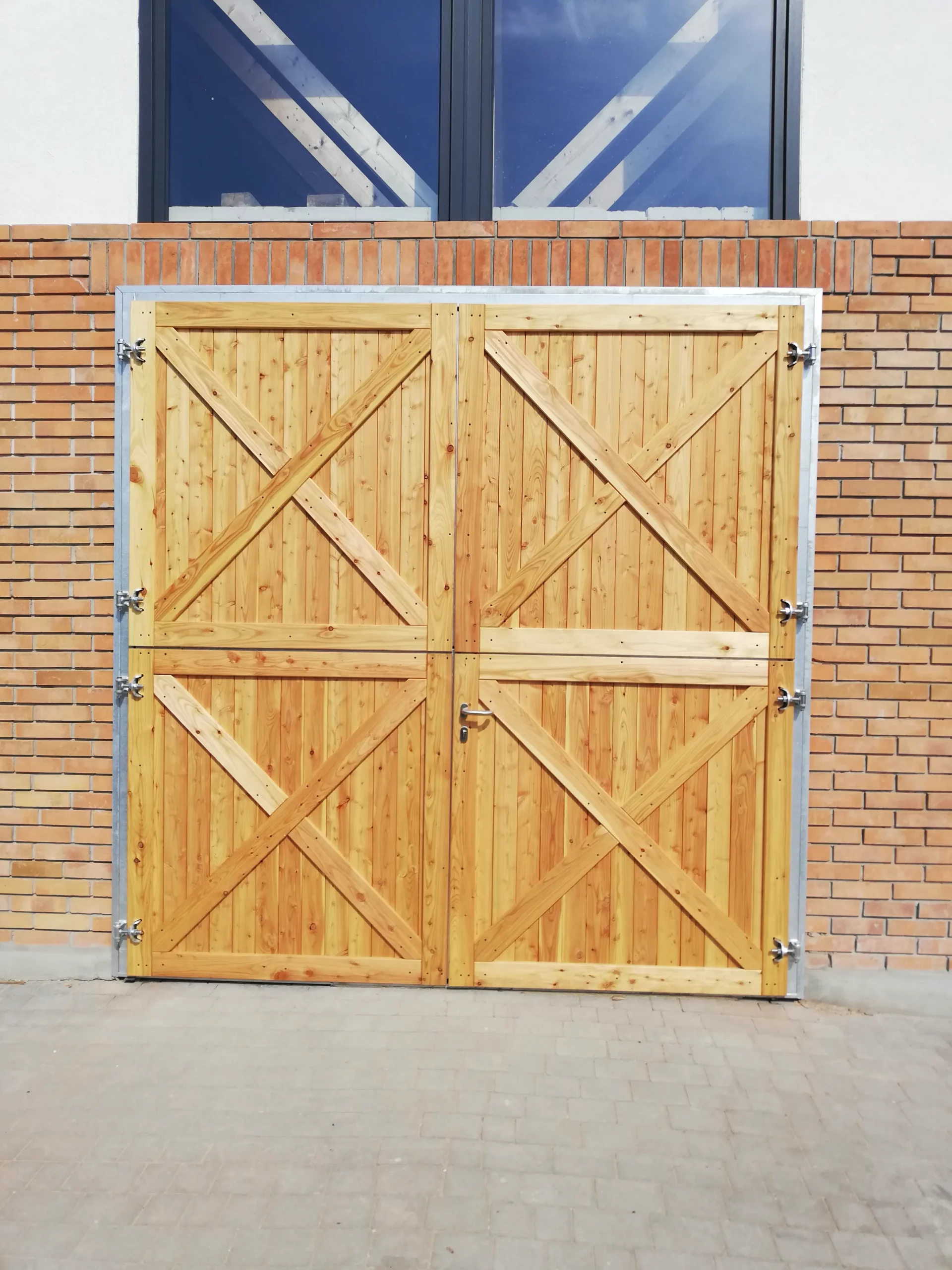 Brama wewnętrzna dwudzielna, deski sosnowe zaimpregnowane, konstrukcja metalowa ocynkowana. Brama ozdobiona X-ami.