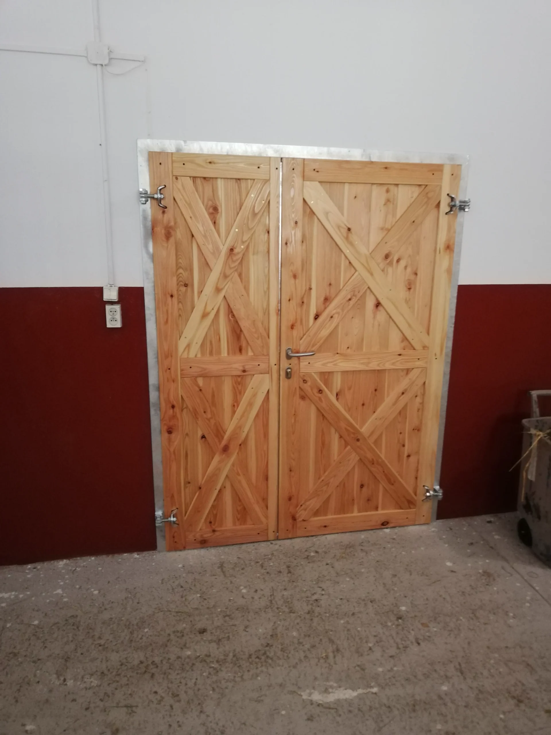 Drzwi dwuczęściowe, deski sosnowe malowane, u góry szyba bezpieczna, szprosy i krata, konstrukcja metalowa ocynkowana i malowana proszkowo.