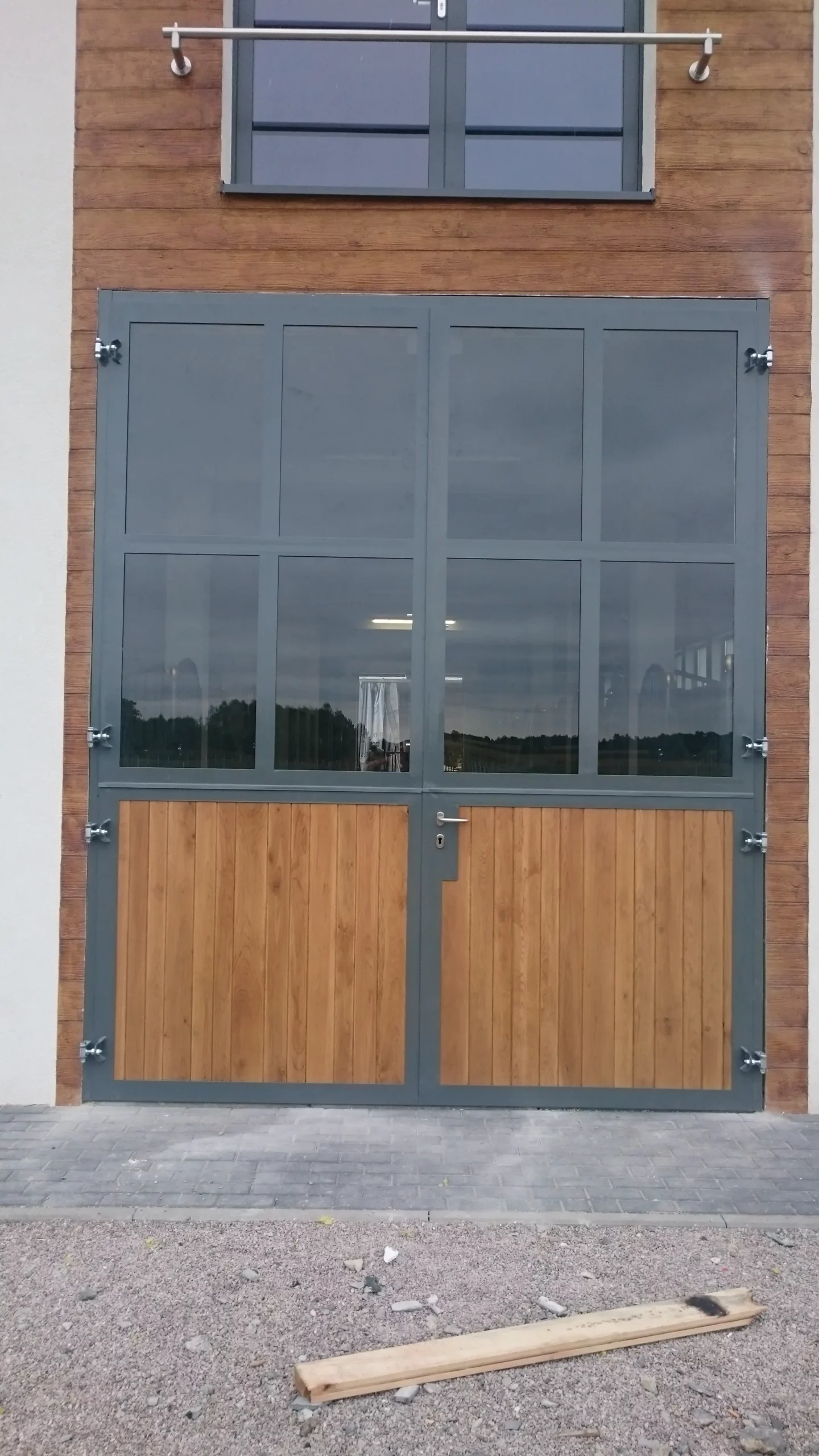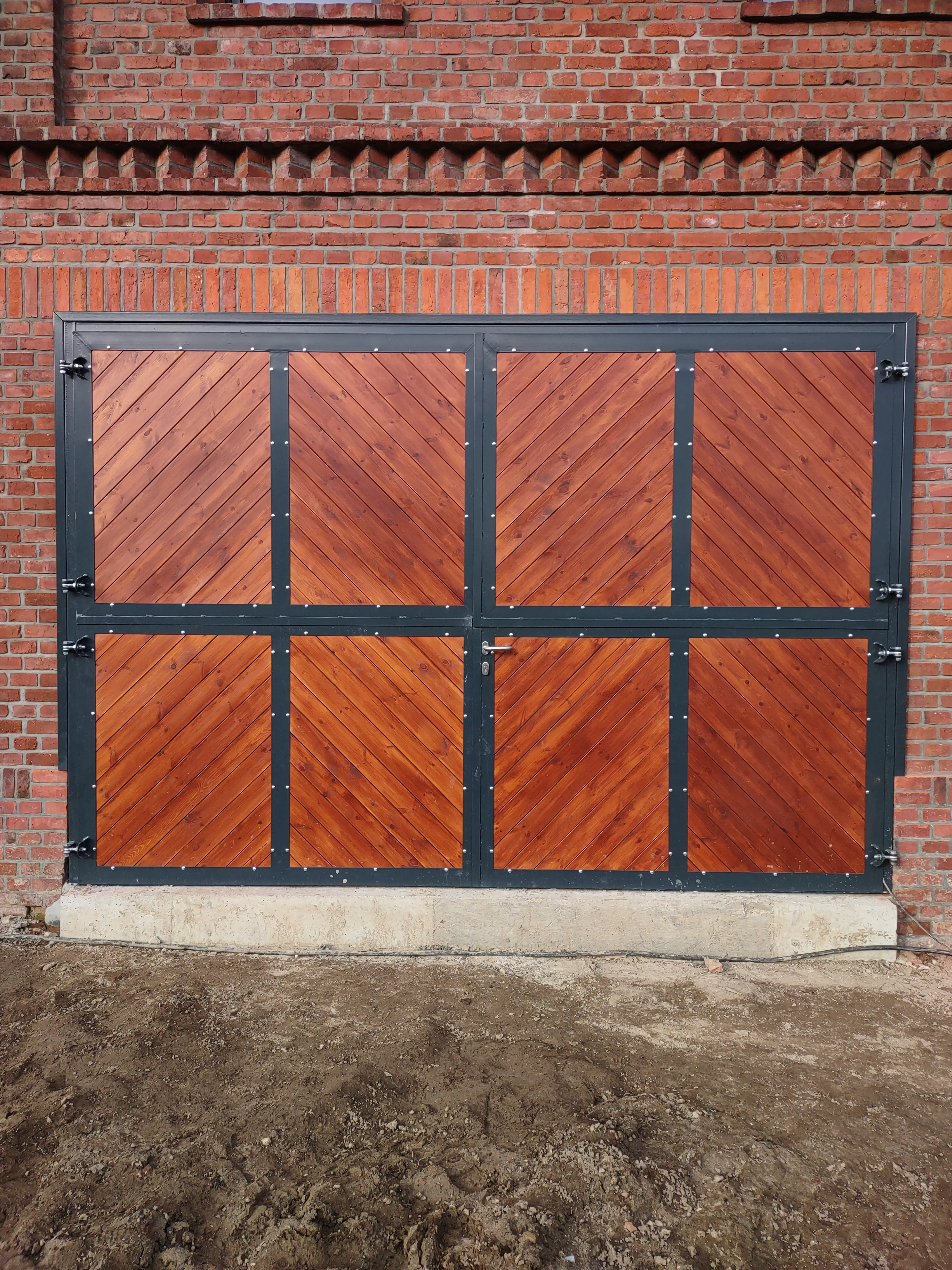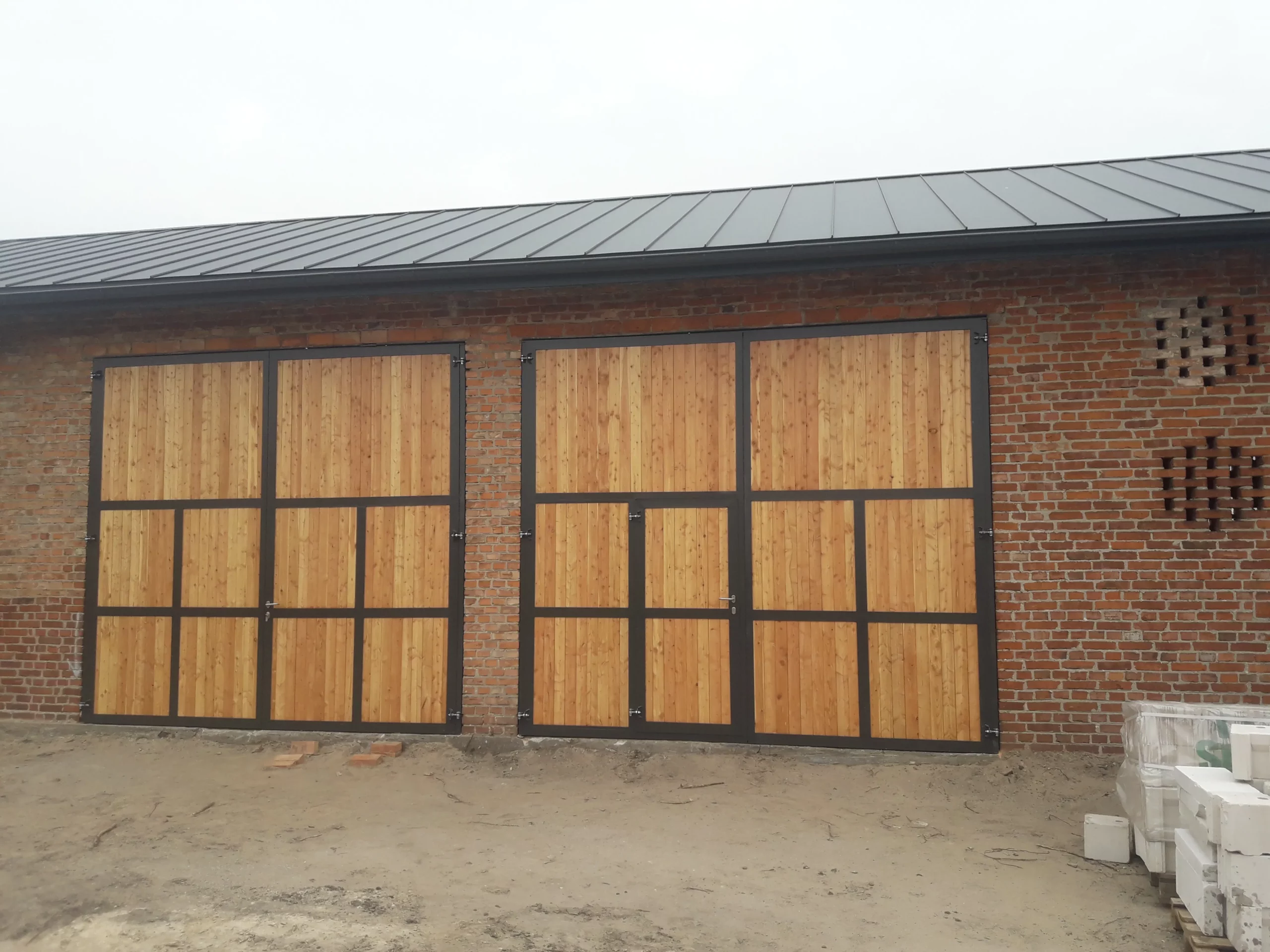 Bramy do stodoły dwudzielne, jedna z bram posiada dodatkowe drzwi, deski modrzewiowe zabezpieczone bezbarwnym impregnatem, konstrukcja metalowa ocynkowana i pomalowana proszkowo (RAL 7016)