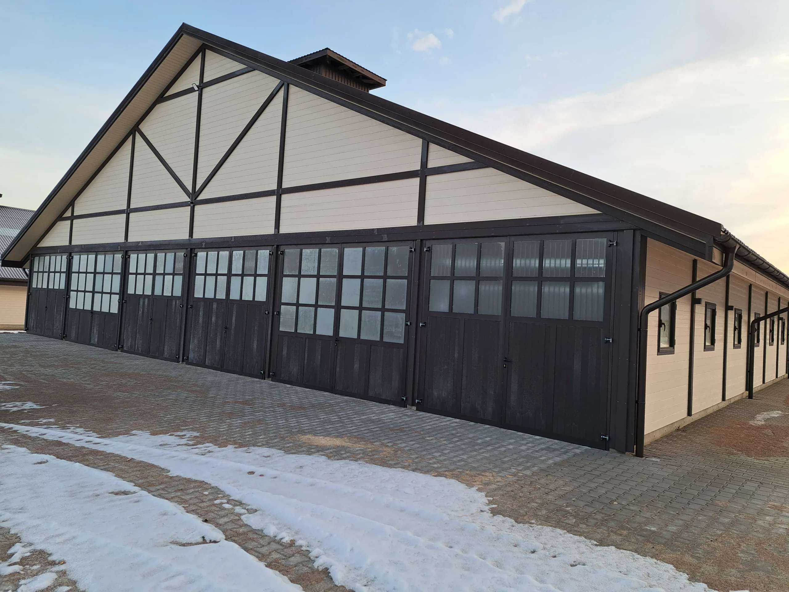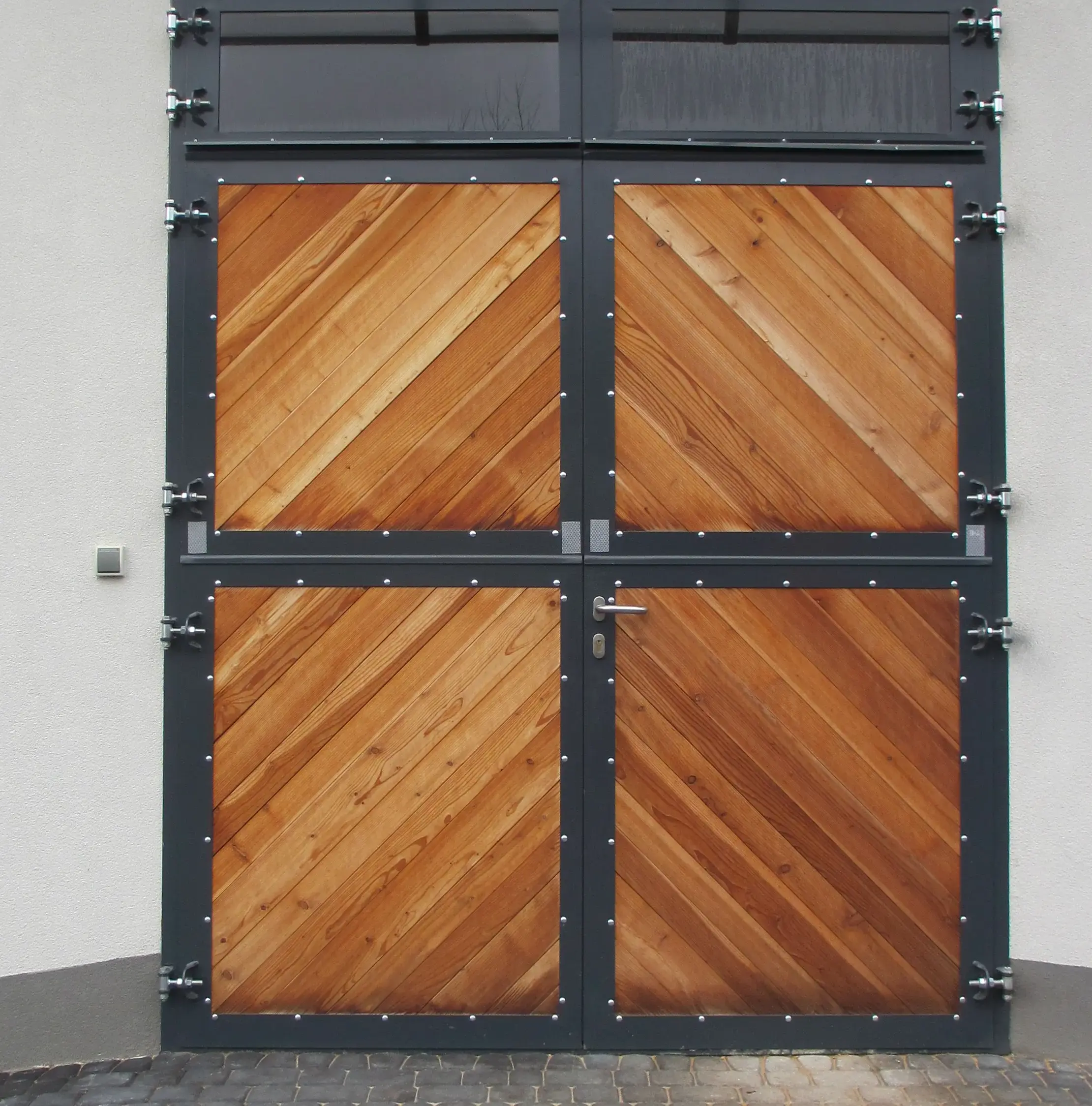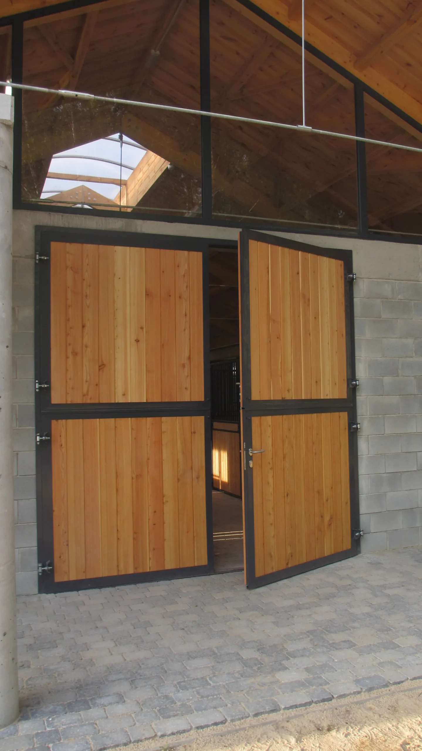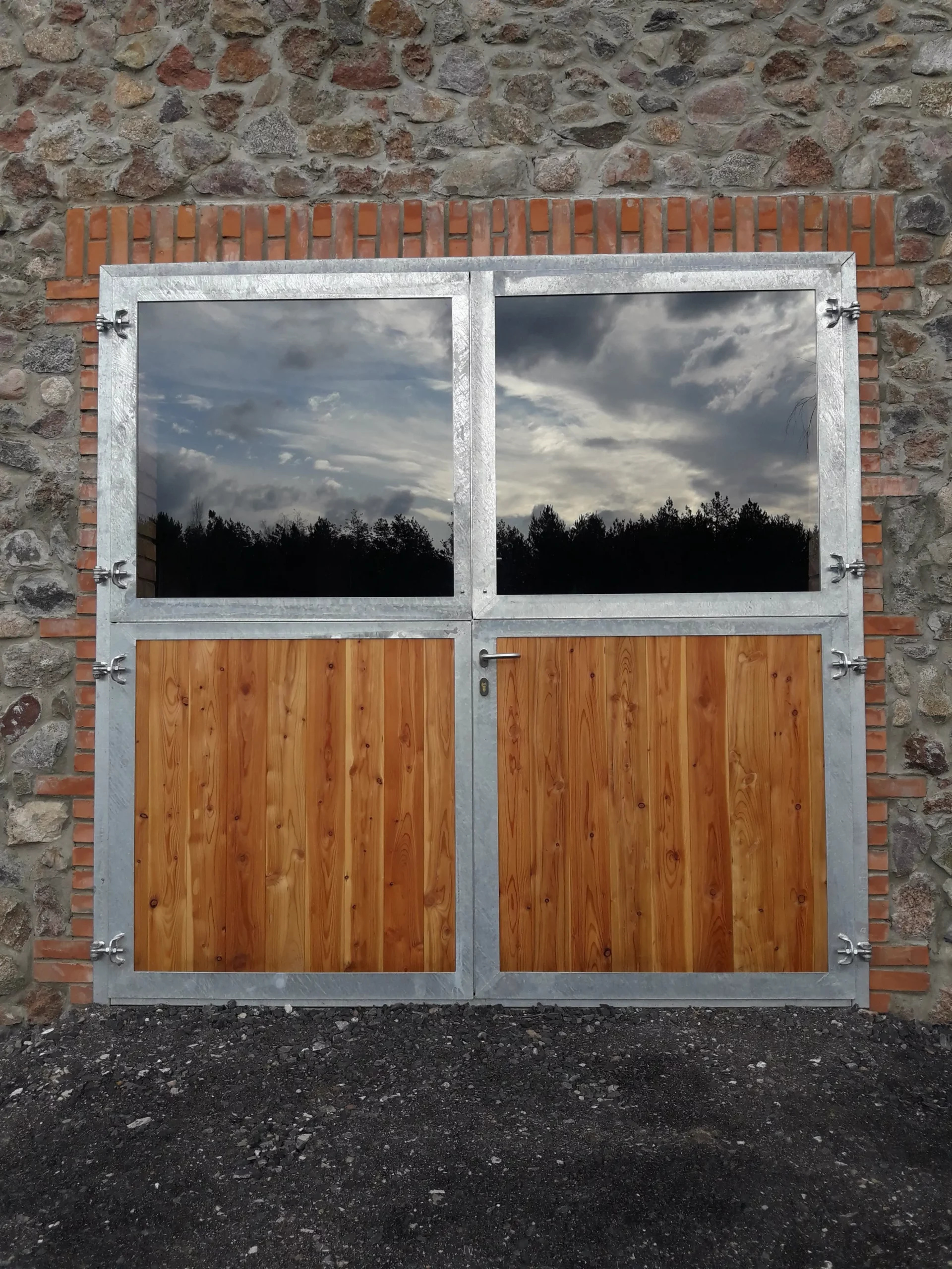 Bramy do stodoły dwudzielne, jedna z bram posiada dodatkowe drzwi, deski modrzewiowe zabezpieczone bezbarwnym impregnatem, konstrukcja metalowa ocynkowana i pomalowana proszkowo (RAL 7016)
