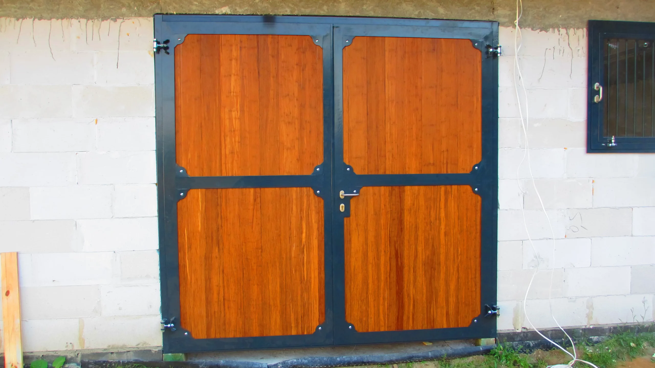 Brama dwudzielna, deski sosnowe malowane, w górnej części szyba bezpieczna, konstrukcja metalowa ocynkowana i malowana proszkowo (RAL 7016).