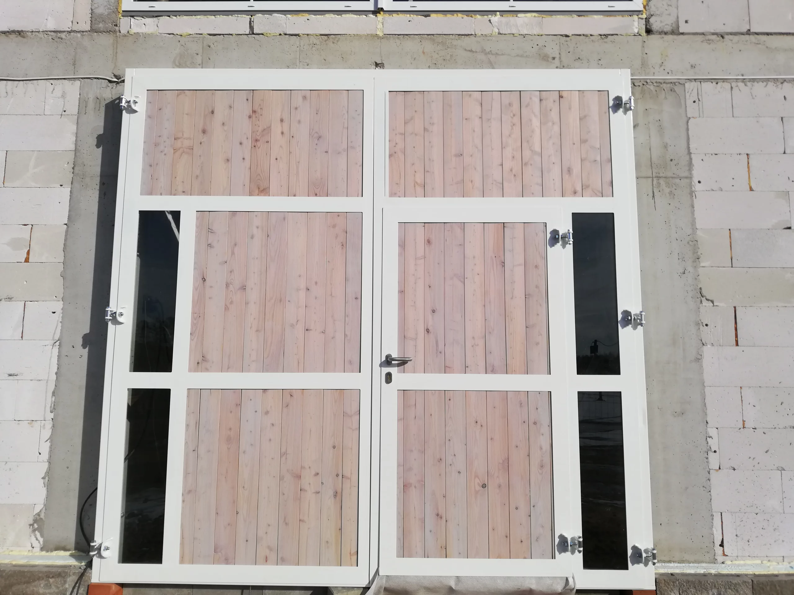 Brama dwudzielna z dodatkowymi drzwiami, deski sosnowe wybielane, konstrukcja metalowa ocynkowana i pomalowana proszkowo, dodatkowe przeszklenia w bocznej części bramy.