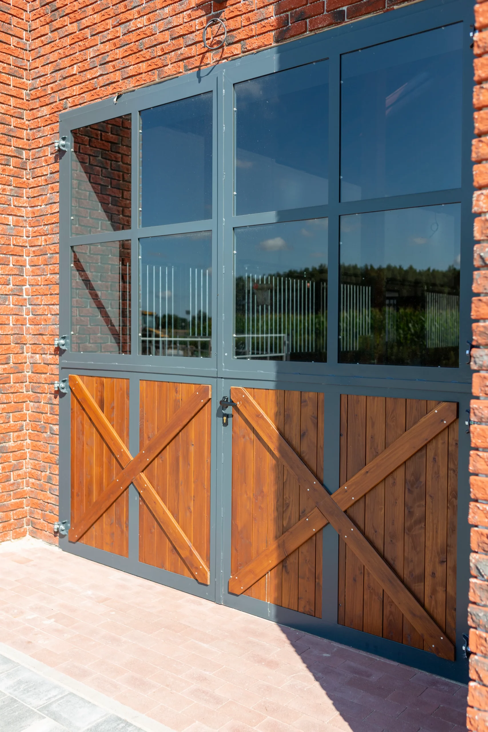 Brama czterodzielna, deski sosnowe malowane, w górnej części szyba bezpieczna. Konstrukcja metalowa ocynkowana i malowana proszkowo, dodatkowe „X” ozdobne w dolnej części.