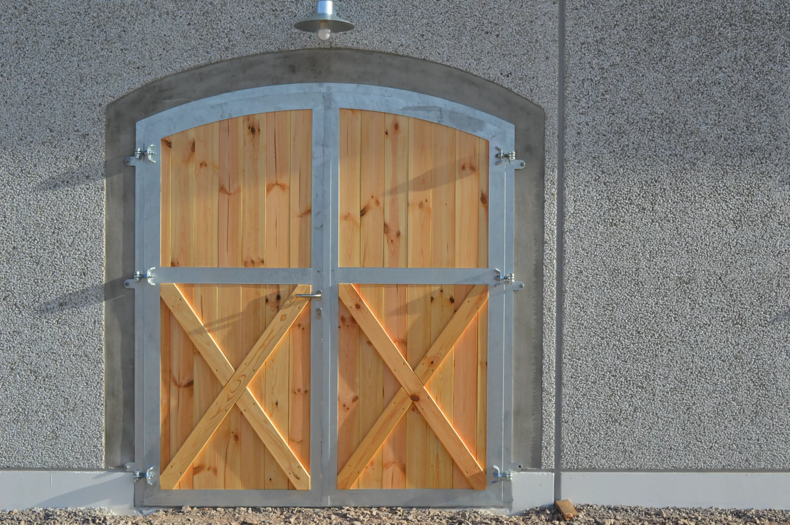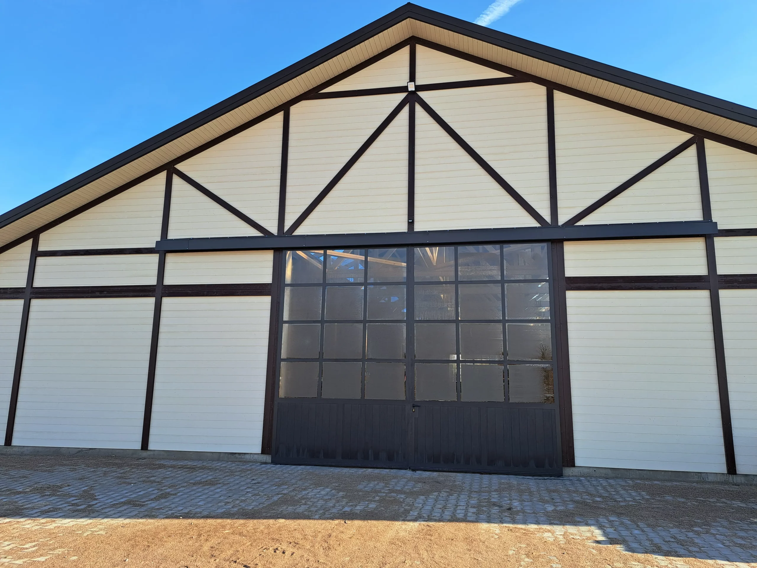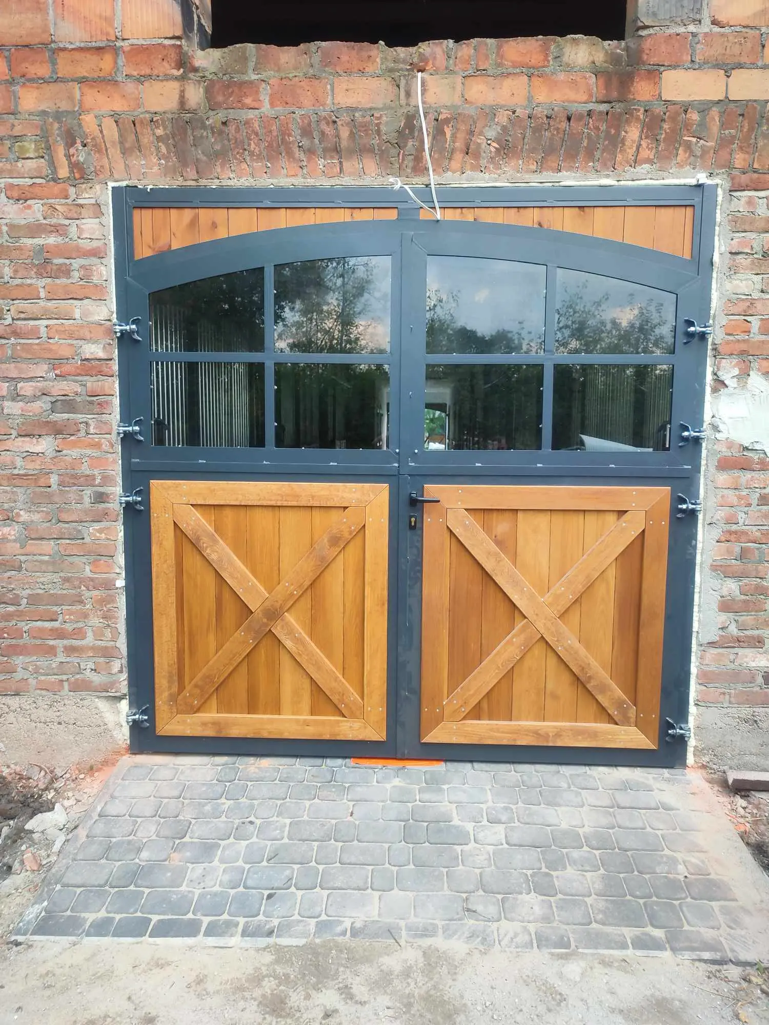 Brama dwudzielna, deski sosnowe malowane, w górnej części szyba bezpieczna, konstrukcja metalowa ocynkowana i malowana proszkowo.