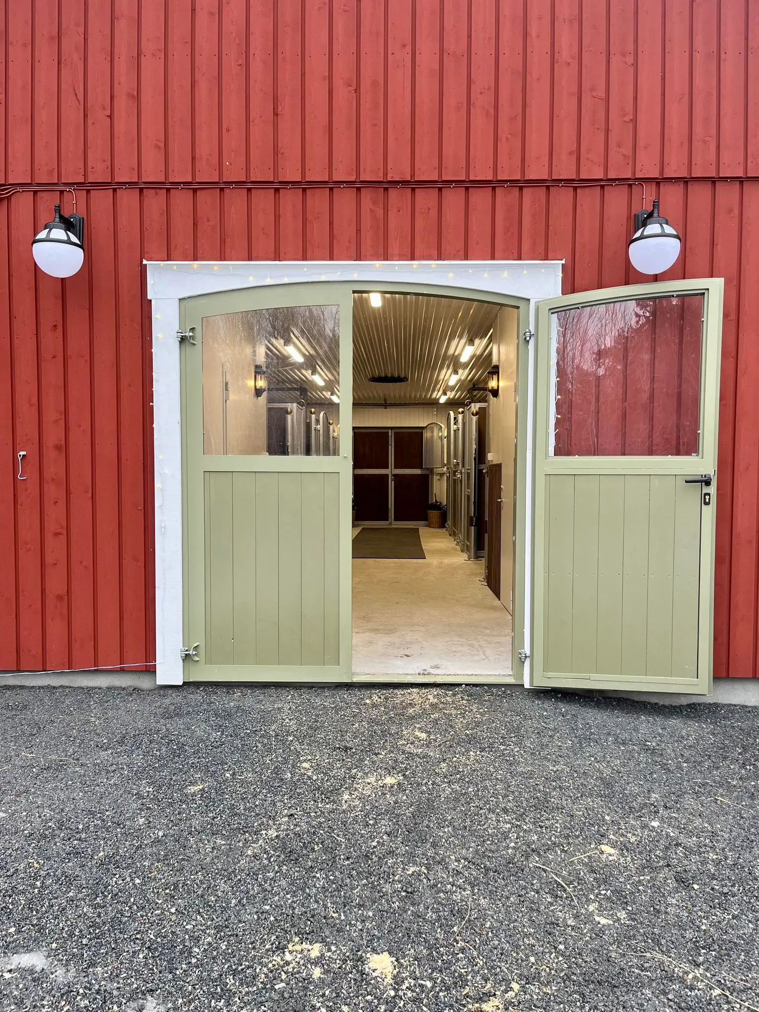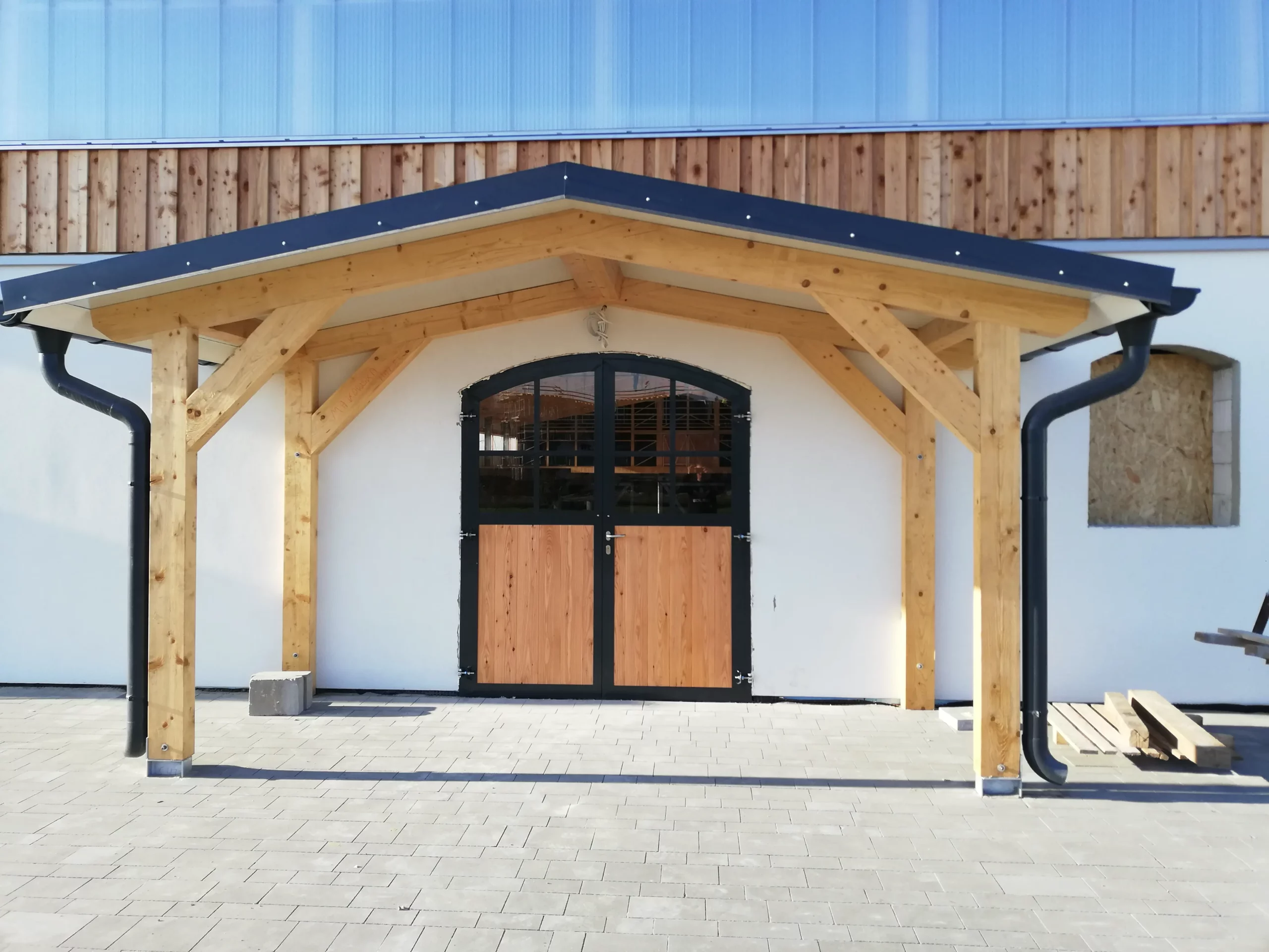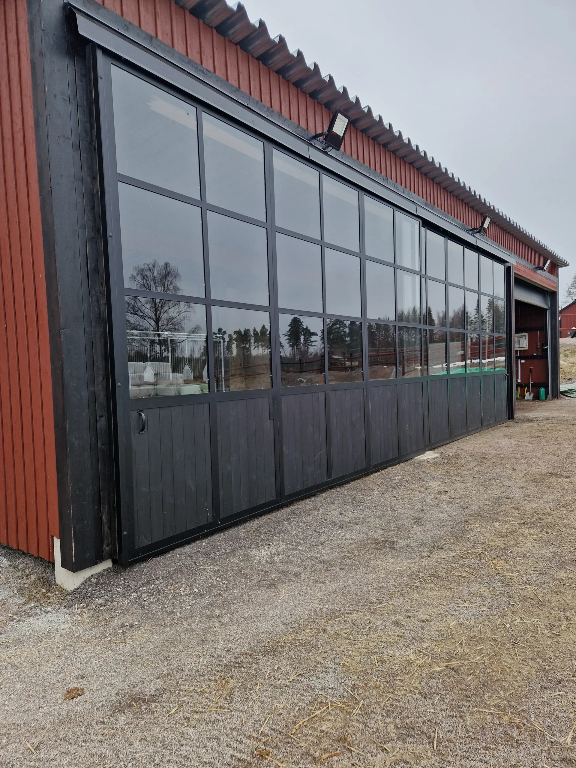Brama dwudzielna, deski sosnowe malowane, w górnej części szyba bezpieczna, konstrukcja metalowa ocynkowana i malowana proszkowo.