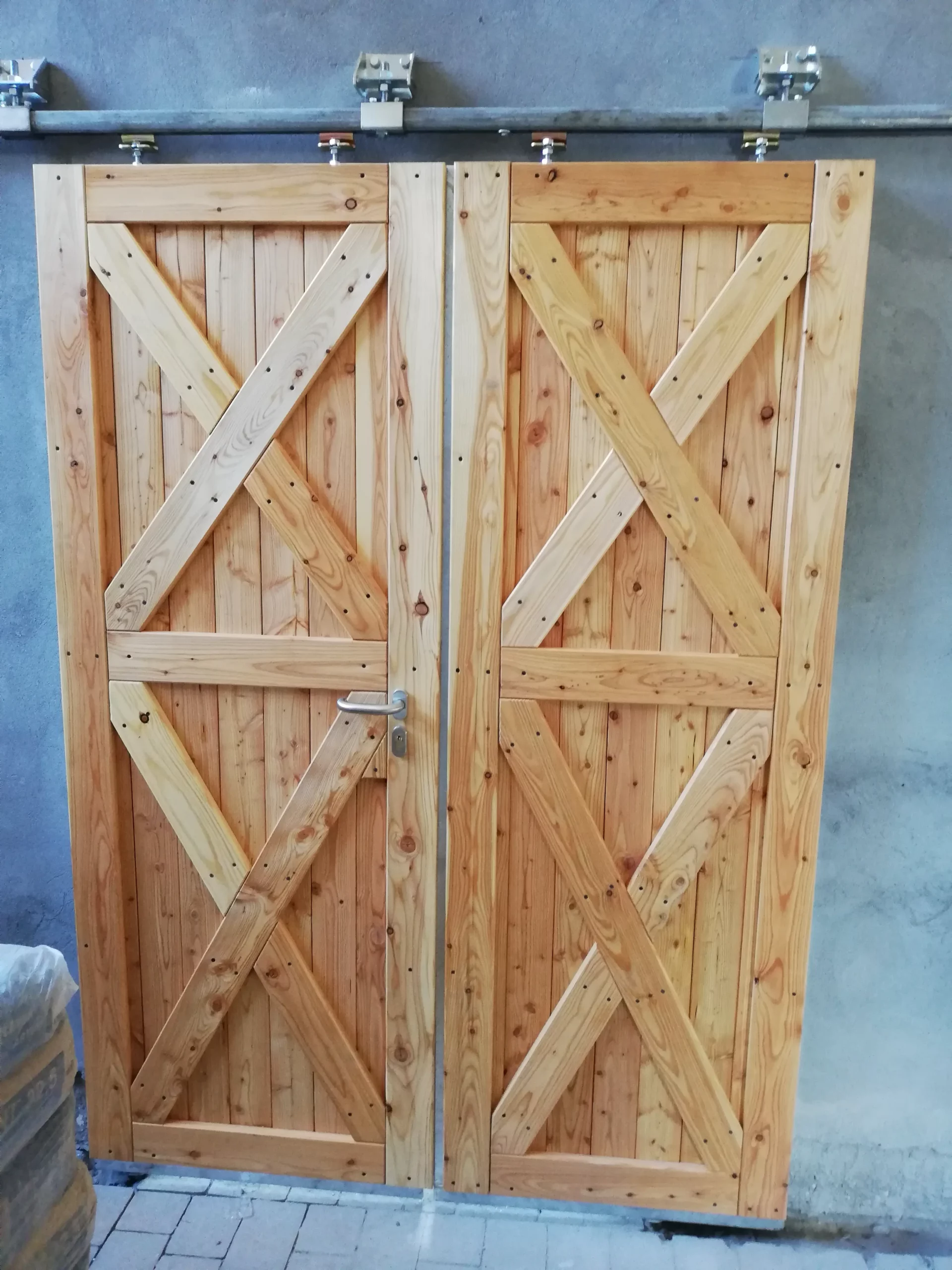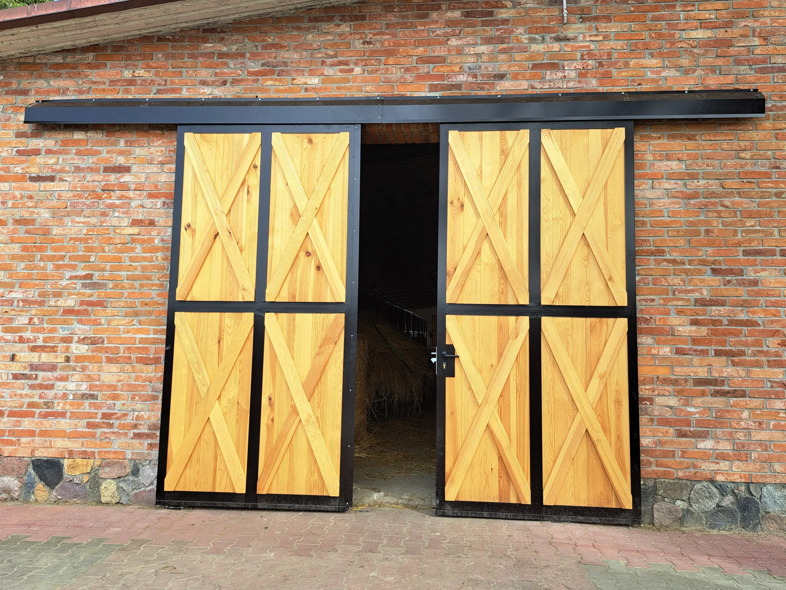 Brama wewnętrzna, dwudzielna i przesuwna, deski sosnowe impregnowane z dodatkowymi „x” ozdobnymi, konstrukcja metalowa ocynkowana.