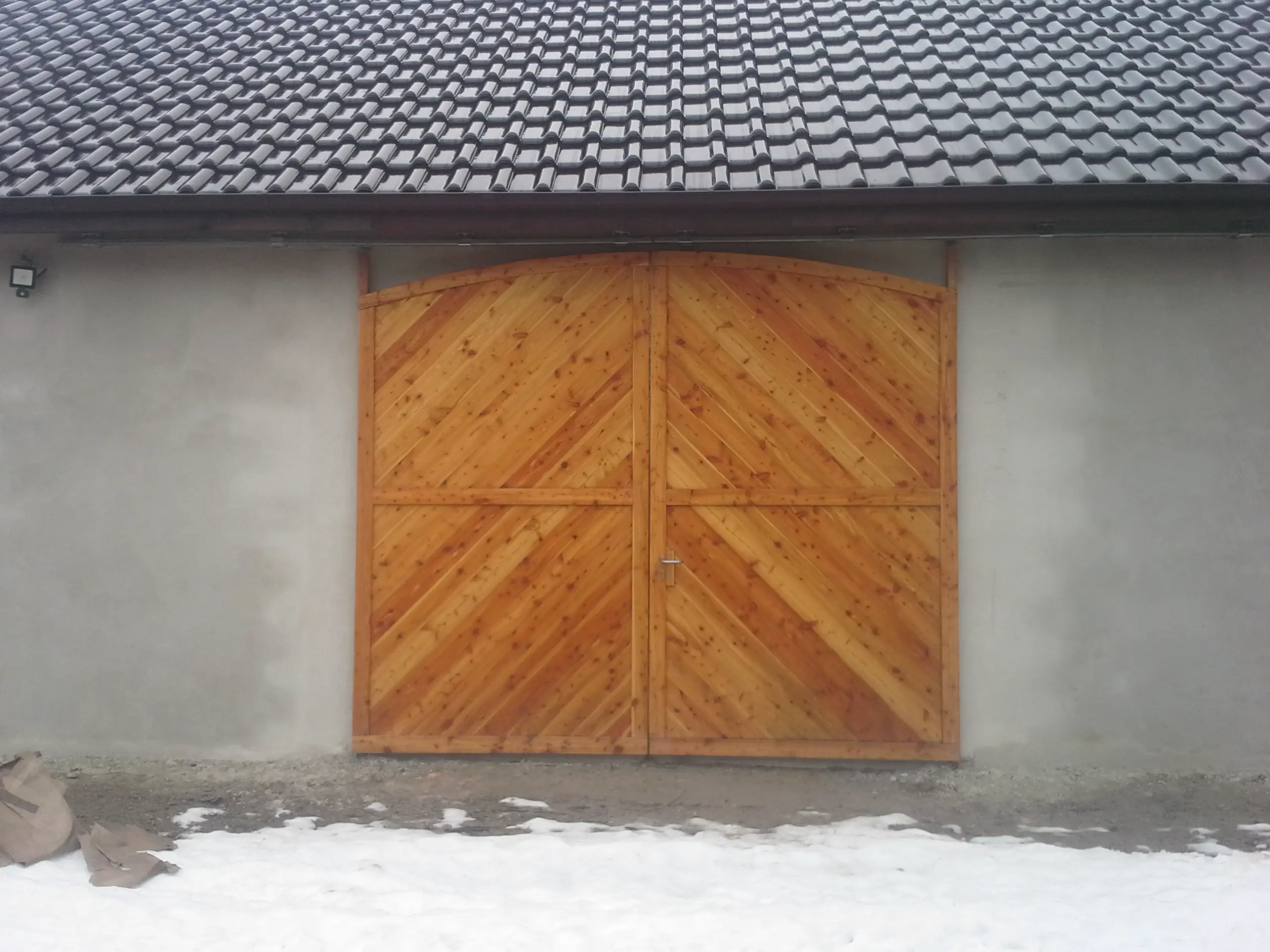 Brama dwudzielna, deski sosnowe impregnowane, w górnej części szyba bezpieczna, konstrukcja metalowa ocynkowana i malowana proszkowo.